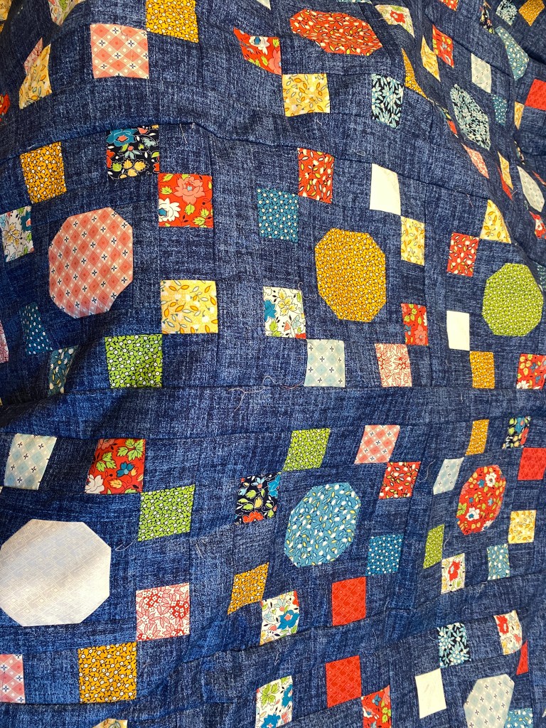 I did finally finish the Strawberry Picnic quilt this week, needs binding though. I put the Noel quilt on next, and I’m about ½ way through it. Once the Split Nine patch quilt is done, it’ll free up my sewing table and I can get the bindings done on those two three, (don’t forget Morning Glory). I also go the Spot-on quilt top together, it will join the TBQ pile too. Next up is the Moondance Revival, as the backing for it was delivered.