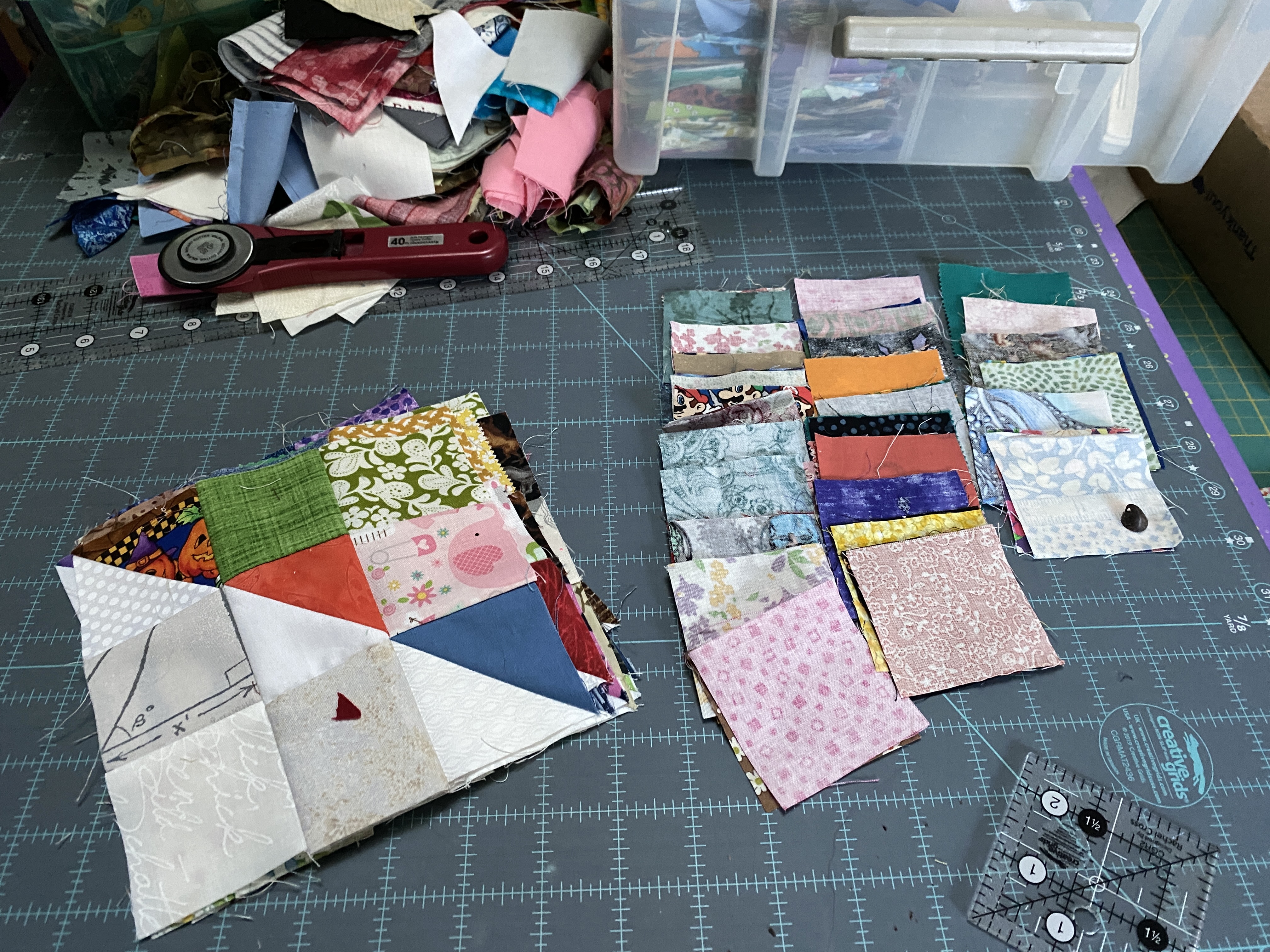 I have been sewing blocks like a mad/crazy person these past few days. I only have 26 more to do, I have sewn 230 so far of the 256 I need for the split nine’s quilt top I have in mind. Amazingly enough I can see the bottom of my 2 ½ inch squares box, there are still plenty of squares in there for another project or two. I am excited to finish these, and put it all together. I figured out how many yards of fabric the 2 ½ inch squares would be if they were all cut from the same piece. There are 224 in a yard, and I used 6 per block so 1536 (white and colors)that makes about 6 and 3/4 yards. There are 6 half square triangles in each block, also 1536 pieces. There are about 336 – 2 ½ inch triangles in a yard, so 4 ½ yards for those. 11 and 1/4 yards for this top, it makes a dent in the stash.