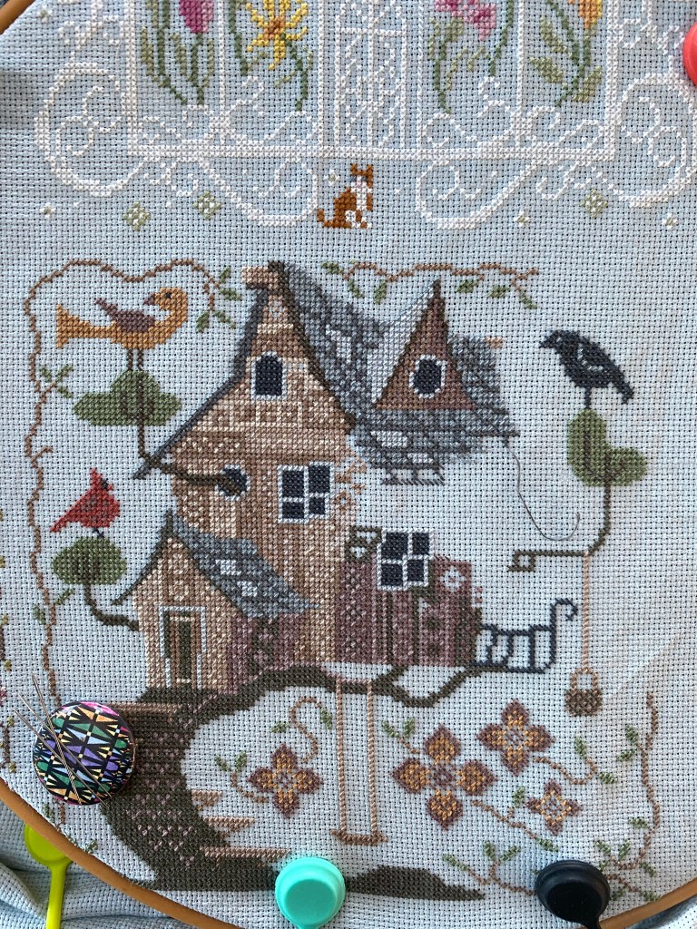I have been busily working on the Tree House of the fabulous house series. It is taking forever, and the pressure to finish it is that the next house pattern will be here soon, maybe even today. I need to rip out a few stitches, as I miss counted with the roof tiles. The next house is a barn, it looks pretty dense also.