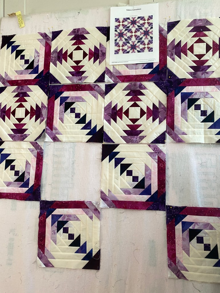 Just to keep myself from starting something new, I pulled out an UFO. This was a kit I got from Craftsy, called Punch Bowl, and I wanted to use the Creative Grids ruler for it. However, I think I made the “A” blocks and then made one “B” block to find that they weren’t the same size. Meaning that they didn’t fit together like the pattern. I sewed all the A’s together, but didn’t like how it looked and put it all in a basket for time out. Time in started yesterday, I pulled it all out and tried to make sense of it all (Note To Self “TAKE NOTES”). I took all the block A’s apart and decided to make as many block B’s as I could. My new block B is the same size as the A, and the layout is a bit different than the original pattern. I think I have enough fabric to make 36 blocks total. The original pattern was for a 90 inch square quilt, mine will be 60 inches square.
