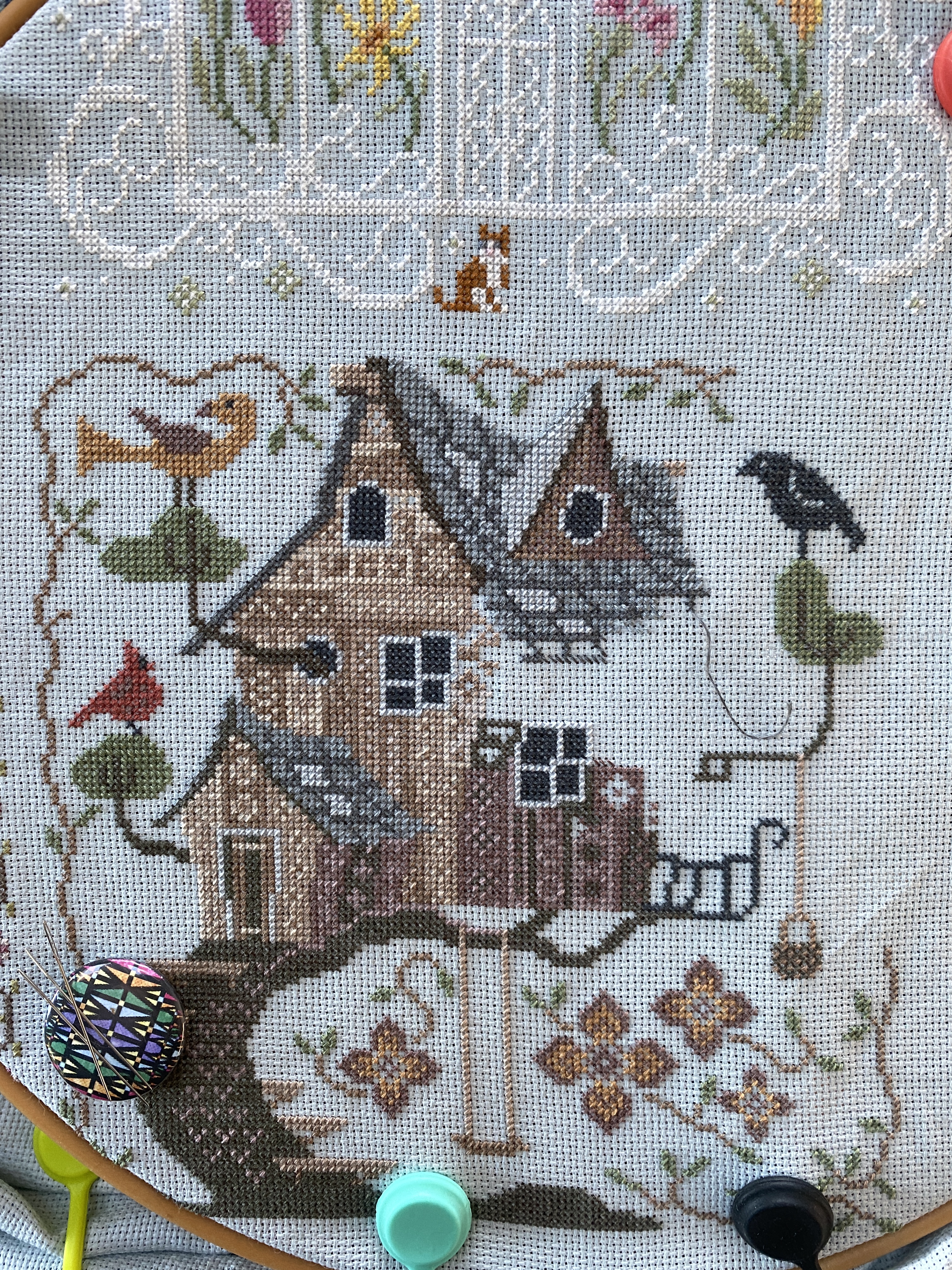 I have been busily working on the Tree House of the fabulous house series. It is taking forever, and the pressure to finish it is that the next house pattern will be here soon, maybe even today. I need to rip out a few stitches, as I miss counted with the roof tiles. The next house is a barn, it looks pretty dense also.