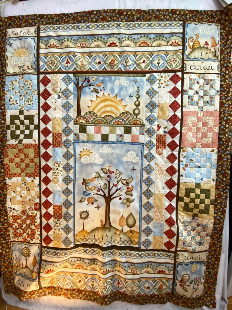 I was able to get the Rise and Conquer quilt kit together. There was a little bit of swearing then too, but it all worked out. The two and a half pages of instruction were just enough guidance to get this top together. There is a tiny bit of fudging, but it’ll quilt out. Yesterday, I was looking for a cool spot in the house to be. and decided to sew a few more rows on the Paisley Fizz top. I am calling it that, as it is a mash up between the fabric line name and the panto I chose for it. The paisley panto is from Wasatch Quilting a few years back. I thought it would work with all the negative space in this quilt. It takes about 30 minutes to stitch a row out though. Funny thing is that I stopped mid row to make dinner and forgot about it last night. As I was going to sleep, I remembered and went to finish it and shut everything down before retiring.
