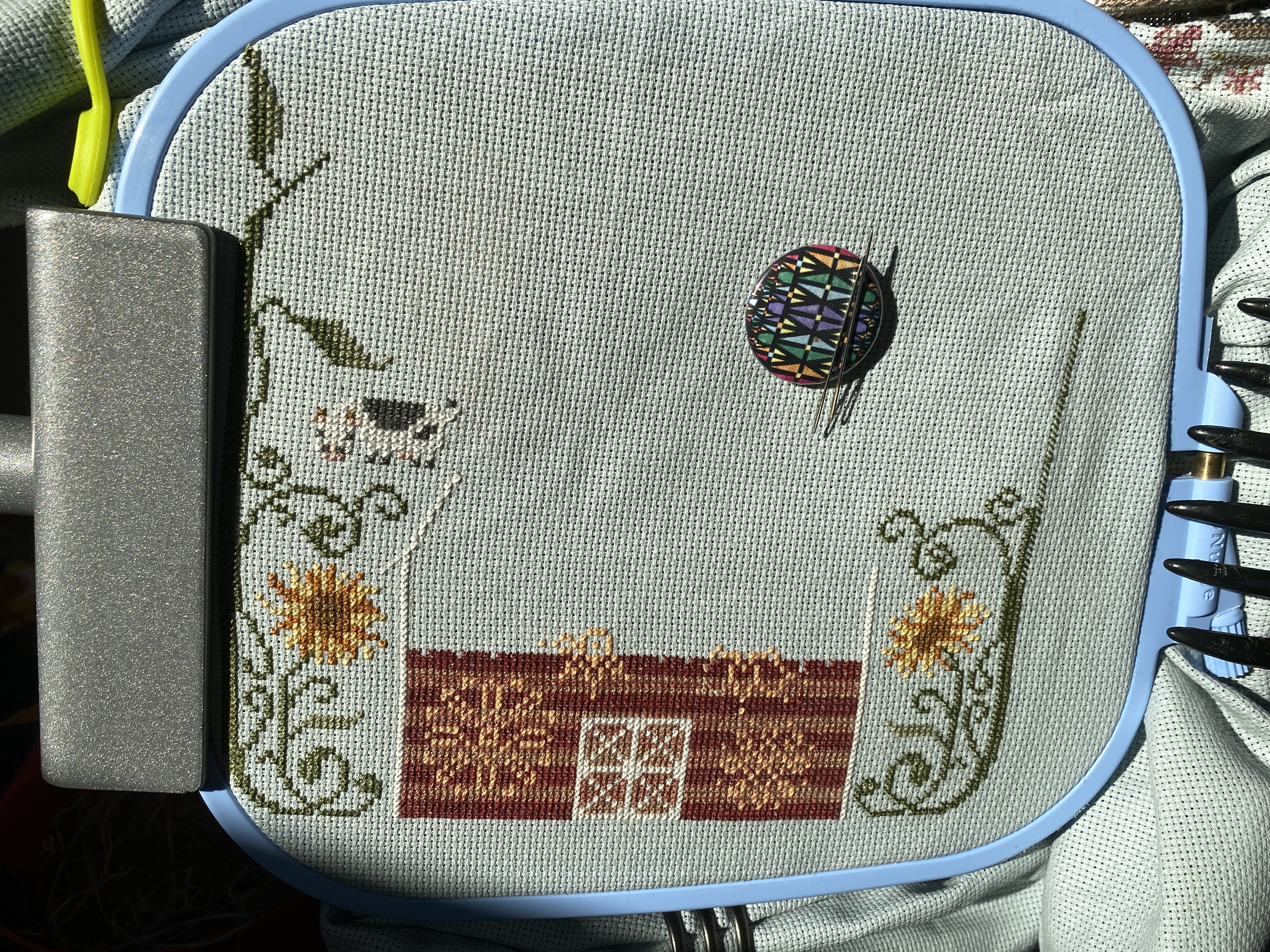 The House Barn is being built stitch by stitch. There are now two sunflowers and a cow, hoping to have this finished by the 15th, when the next one, Light House, is delivered. I have all the floss for that one, and the colors are a bit dull. There is a skein of Calderon (dark gray), which has me wondering if it is a black and white light house. Next one is a floating House, houseboat?