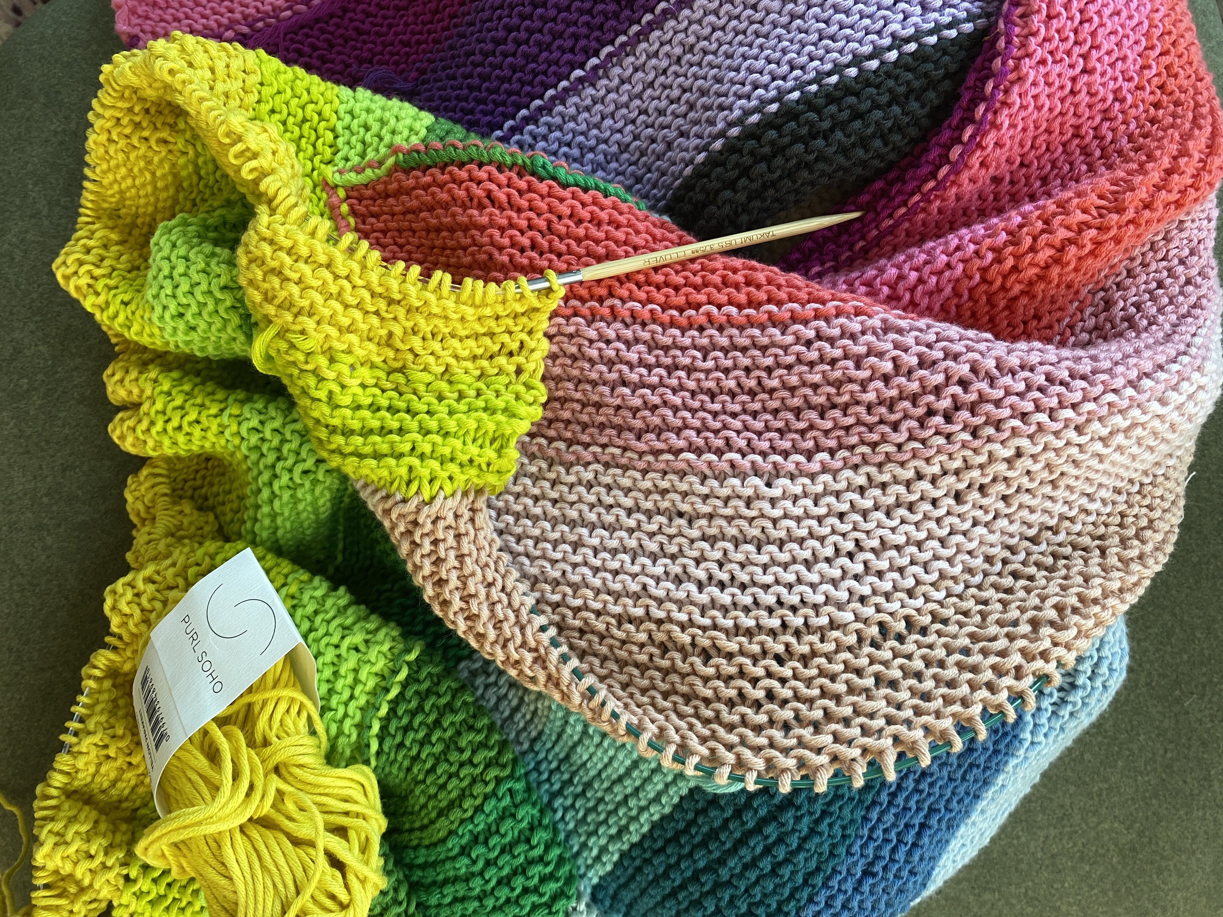 The Good Morning blanket is about 80% done. I have six more color sections, or rows to go. The fabric created by this cotton yarn is quite nice. If I didn’t have a few quilts around here, I would consider making one for my personal use. It’s mindless knitting, although the last section I managed to start on a wrong side and had to purl all the stitches rather than knit them. I flipped it over for the next row, so I am back to regular garter stitch now.