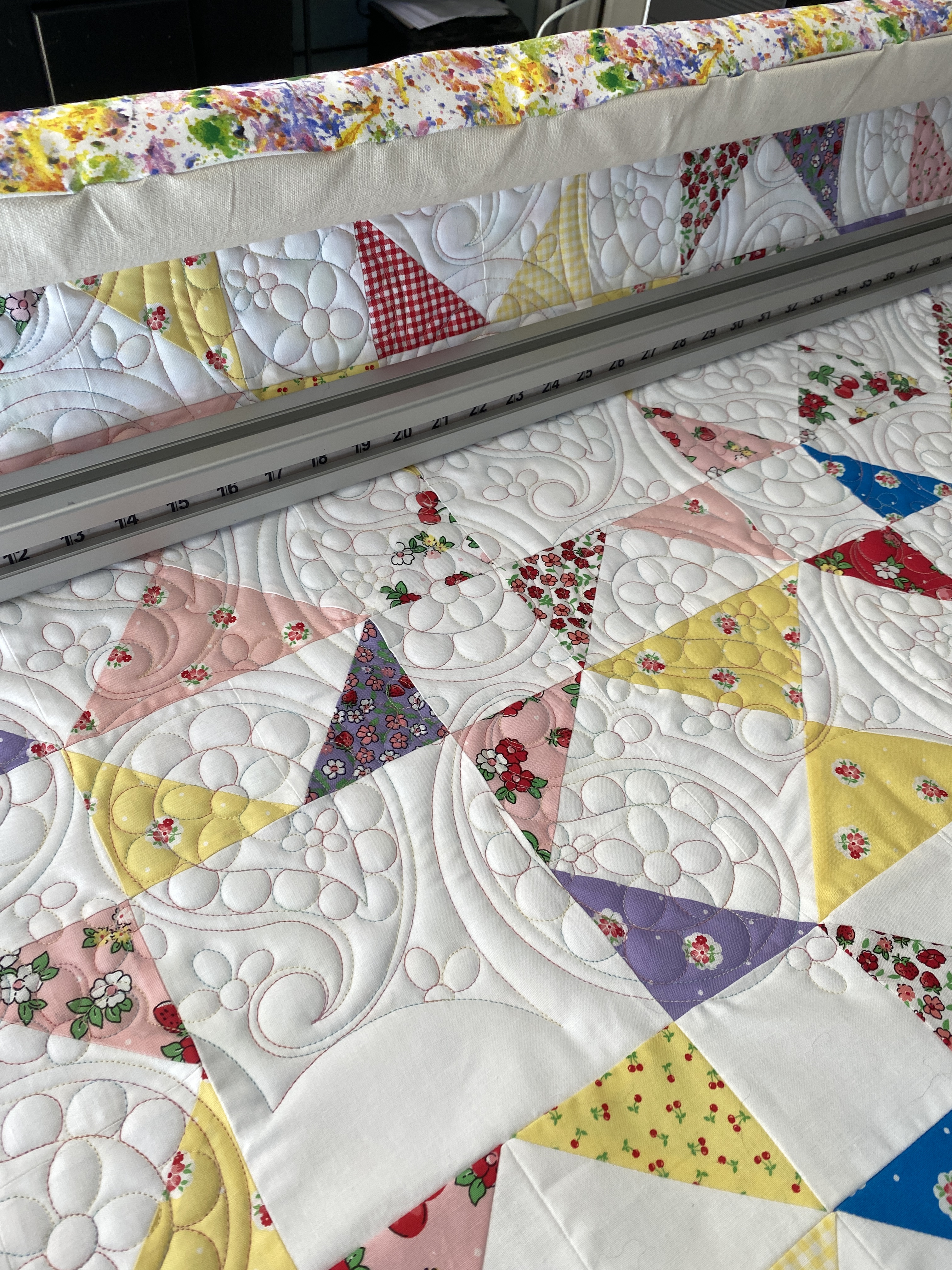I was able to get the Rise and Conquer quilt kit together. There was a little bit of swearing then too, but it all worked out. The two and a half pages of instruction were just enough guidance to get this top together. There is a tiny bit of fudging, but it’ll quilt out. Yesterday, I was looking for a cool spot in the house to be. and decided to sew a few more rows on the Paisley Fizz top. I am calling it that, as it is a mash up between the fabric line name and the panto I chose for it. The paisley panto is from Wasatch Quilting a few years back. I thought it would work with all the negative space in this quilt. It takes about 30 minutes to stitch a row out though. Funny thing is that I stopped mid row to make dinner and forgot about it last night. As I was going to sleep, I remembered and went to finish it and shut everything down before retiring.