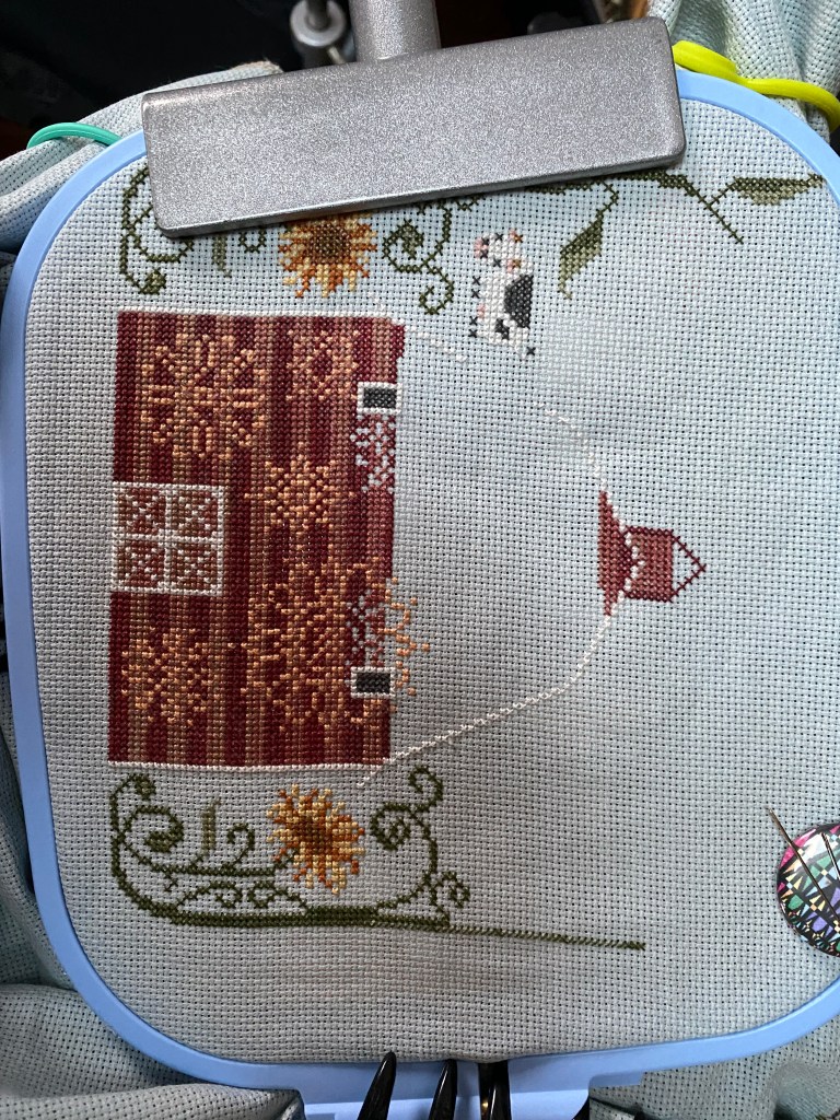 The next Fabulous House was released yesterday, the Light House. I really like it, and would consider making it as a stand alone piece. The Barn is growing, I stitched the cupola last night, and the outline of the roof. I think I am about half way done, the rectangle that forms the body of the barn is 36 rows of 70 stitches, which is 2520 little X-es. Phew.