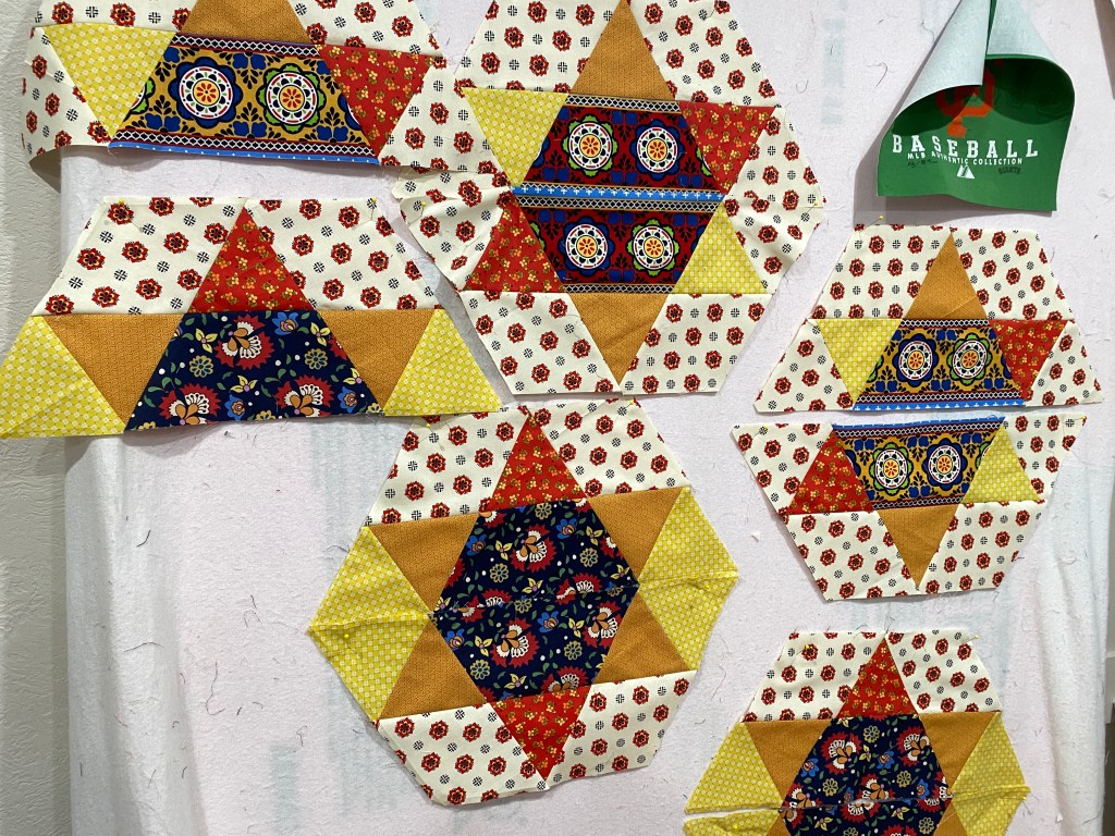 The Fall foliage top is together and I like it. I was thinking of quilting it with a raindrop panto because it reminds me of a puddle with autumn leaves in it. The purple sort of looks like asphalt to me, in a good way, the darkness against the colorful leaves. After finishing the foliage, I decided to pull out another pattern from Krista Moser, called Summer Swag. This one also uses the 60 degree diamond rulers. I still have a bunch of fabric from the Nancy Rink line called El Camino. You may remember the El Camino BOM, from a while ago, and more recently the Wall Flower quilt from 1/2022. There is still quite a bit of yardage left over and time for it to go. I started by sewing the stars together, a half hexagon, 6 triangle and two diamonds. What could be easier? I pieced and pressed and soon had the ten halves I needed. Only as I looked at them on the design wall, something bothered me. The yellow six pointed stars , oh no, not a design element that worked. I recently finished reading “The Nightingale” by Kristin Hannah, it is about two sisters during the German occupation of France. The book/story had an emotional impact on me, as one would expect, and those stars had to go. I took them all apart, and re-sewed them into multicolored stars. I am liking them much more now.