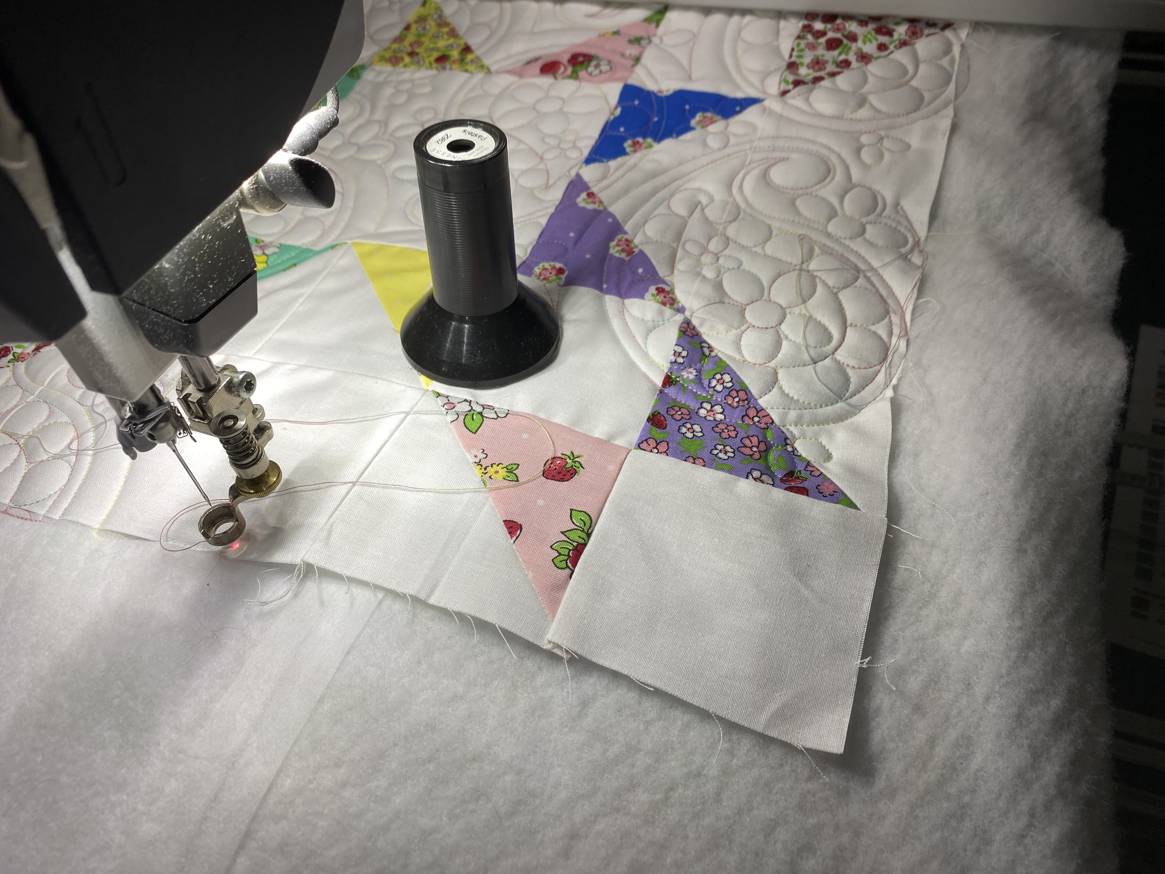 I lost at playing thread chicken this past week. I was getting down to the last motif on the Strawberry/paisley fizz quilt when the Finesse brand spool quit. Luckily, I had a similar color way of Omni, no one will ever know :).