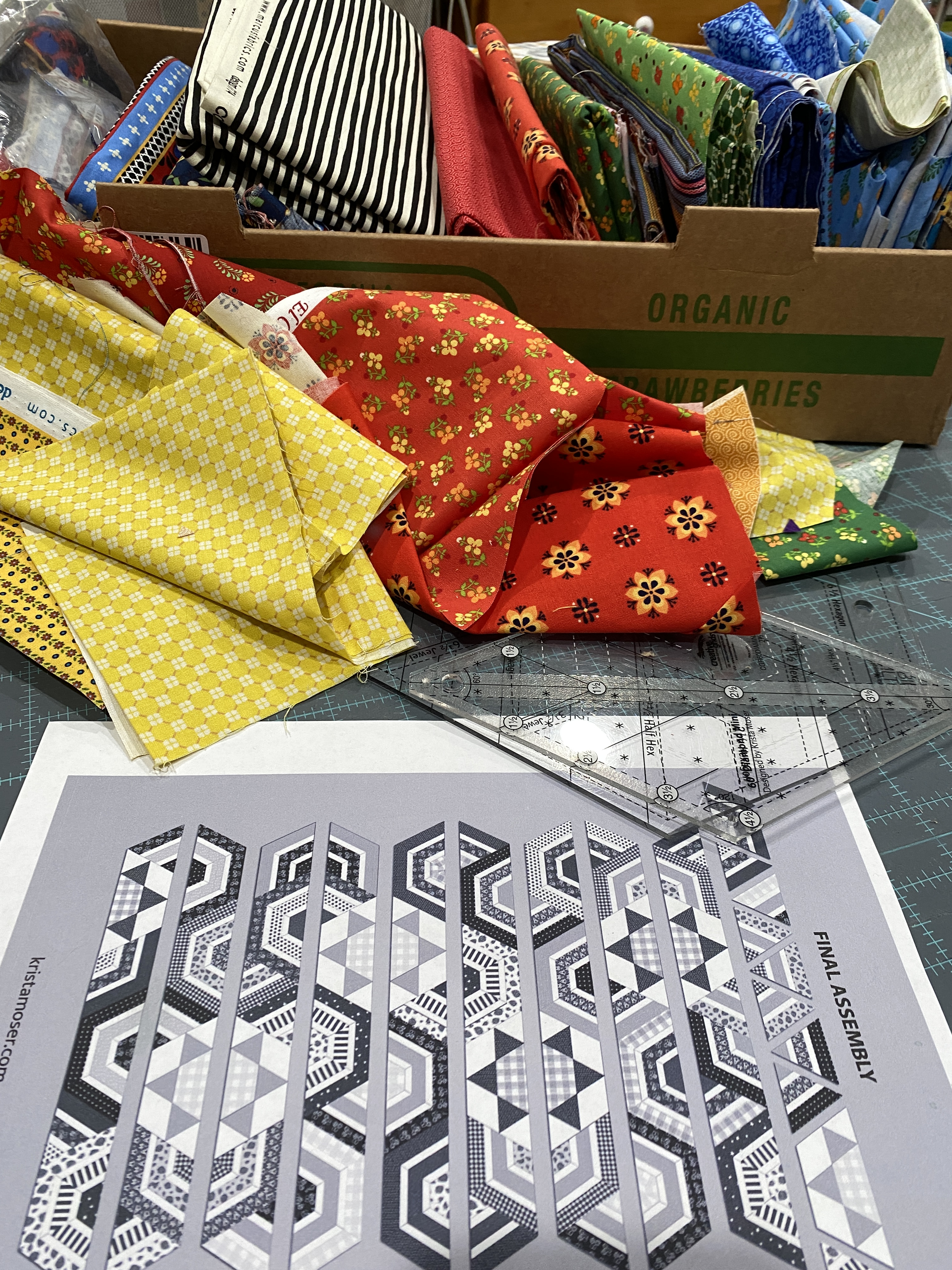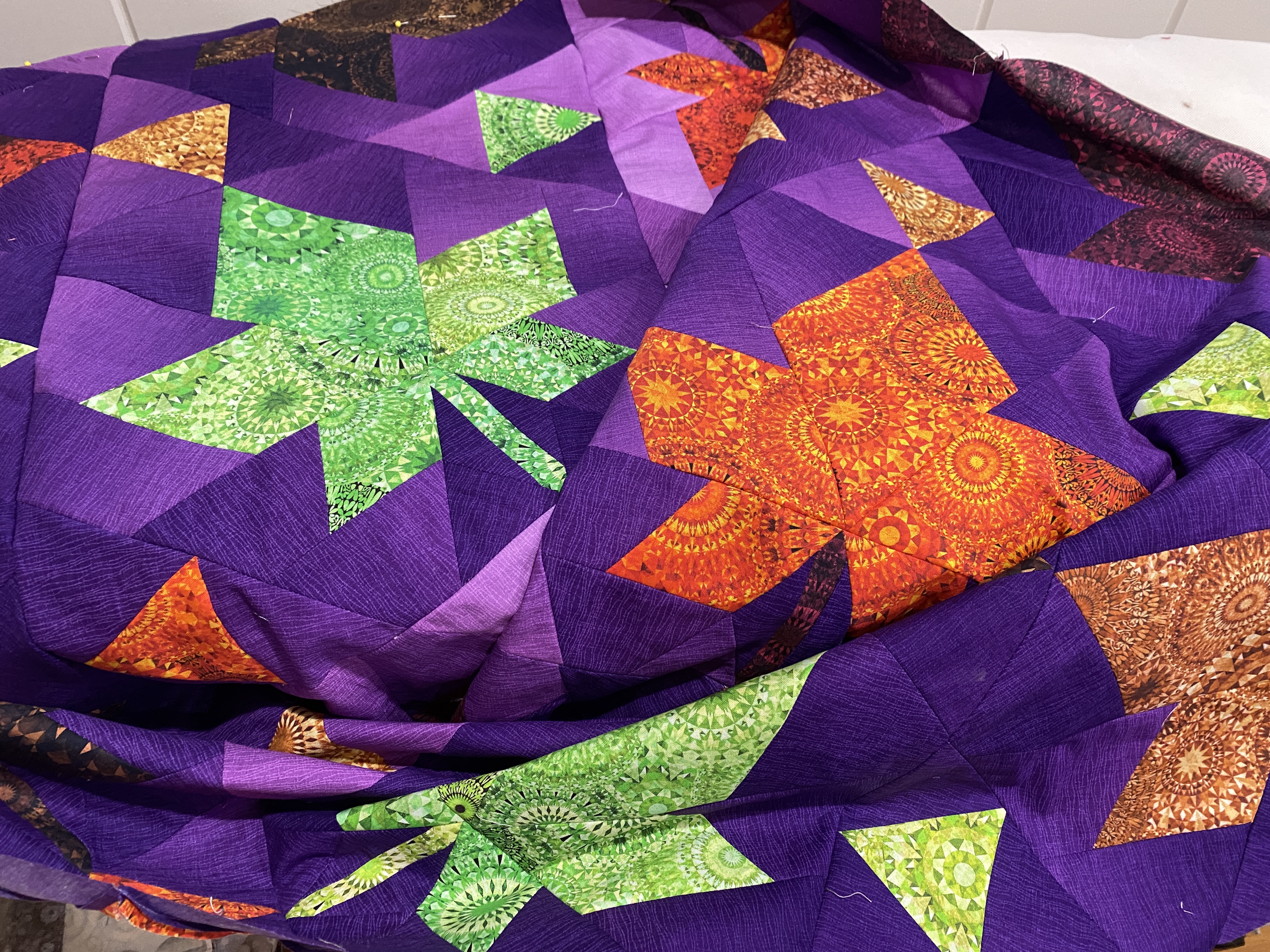 The Fall foliage top is together and I like it. I was thinking of quilting it with a raindrop panto because it reminds me of a puddle with autumn leaves in it. The purple sort of looks like asphalt to me, in a good way, the darkness against the colorful leaves. After finishing the foliage, I decided to pull out another pattern from Krista Moser, called Summer Swag. This one also uses the 60 degree diamond rulers. I still have a bunch of fabric from the Nancy Rink line called El Camino. You may remember the El Camino BOM, from a while ago, and more recently the Wall Flower quilt from 1/2022. There is still quite a bit of yardage left over and time for it to go. I started by sewing the stars together, a half hexagon, 6 triangle and two diamonds. What could be easier? I pieced and pressed and soon had the ten halves I needed. Only as I looked at them on the design wall, something bothered me. The yellow six pointed stars , oh no, not a design element that worked. I recently finished reading “The Nightingale” by Kristin Hannah, it is about two sisters during the German occupation of France. The book/story had an emotional impact on me, as one would expect, and those stars had to go. I took them all apart, and re-sewed them into multicolored stars. I am liking them much more now.