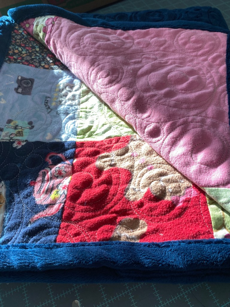 In the finished category this week is the memory quilt. I was thinking about all the things that were not “easy” about this quilt. The tee shirts, the mix of fabrics, satins and flannels and cotton prints. The bead work, some rhinestones, little bows, some lace and pockets. All quilted to a Minkee appliquéd backing, what could possibly go wrong? It all worked out, I learned a little, and I think that having the right equipment and a little experience with using it were the things that helped make this work. Where would I be without a few Youtube videos and tutorials to help me? I ended up binding the quilt by cutting the backing one and a half inches wide than the top and double folding it over to the front and sewing it down. It is such a soft binding for a cuddly quilt.