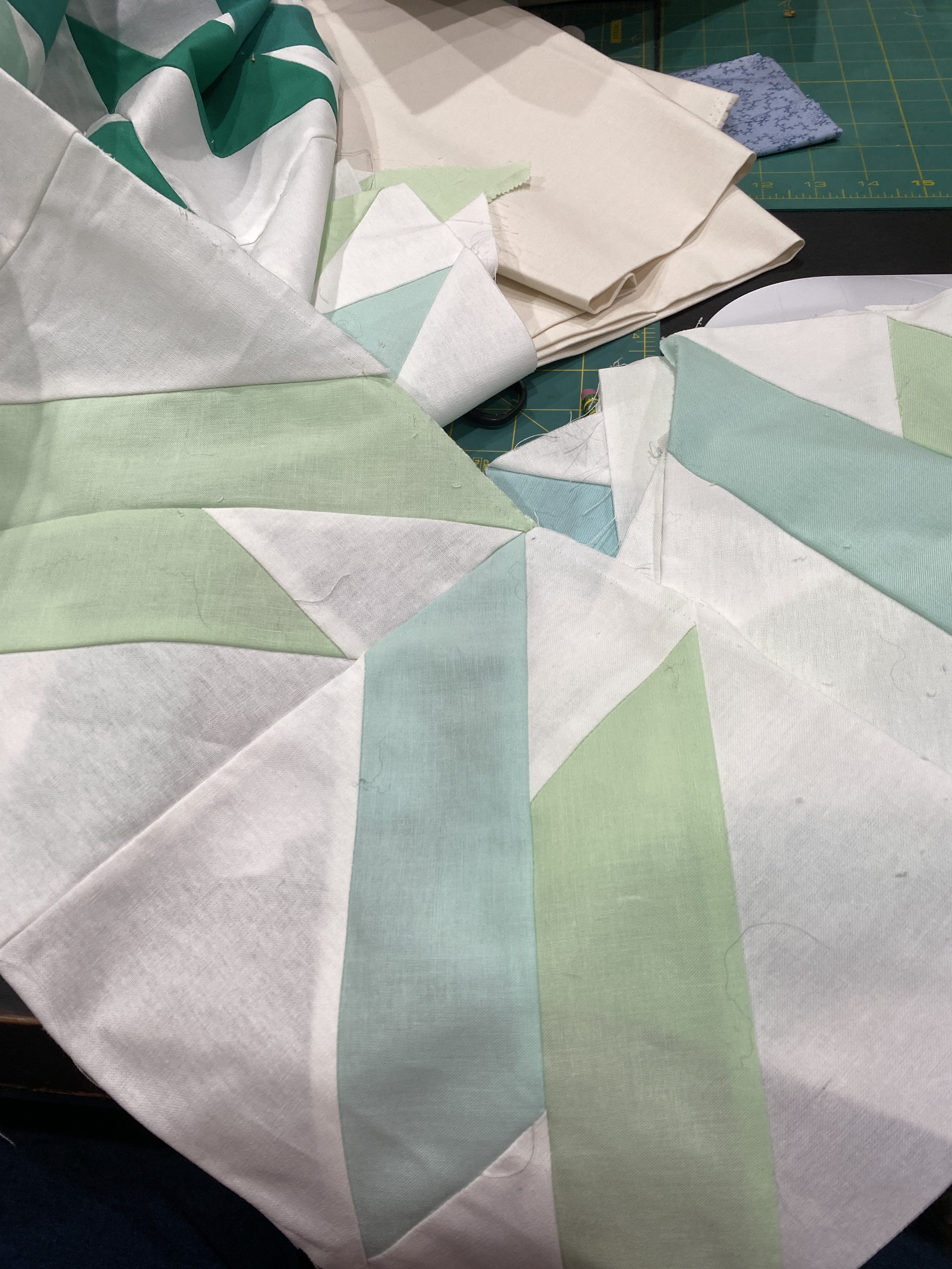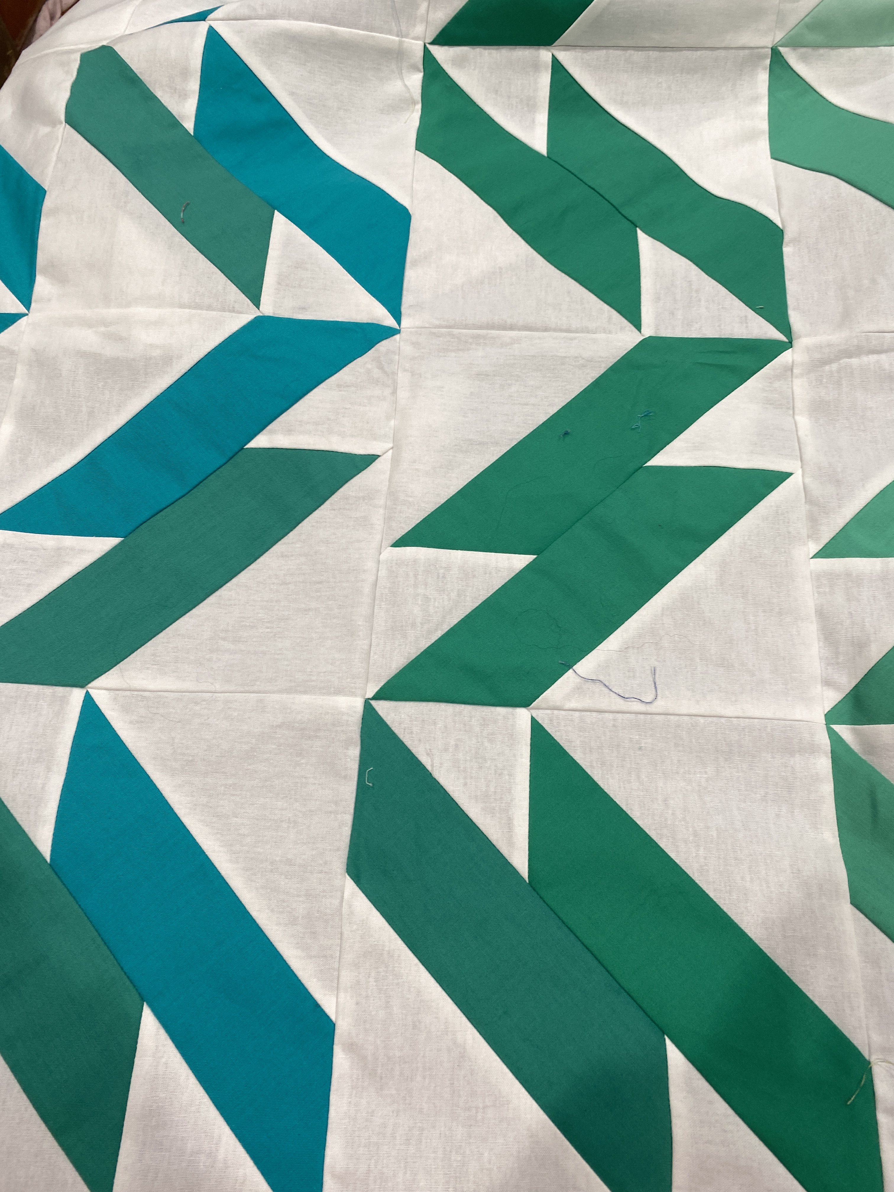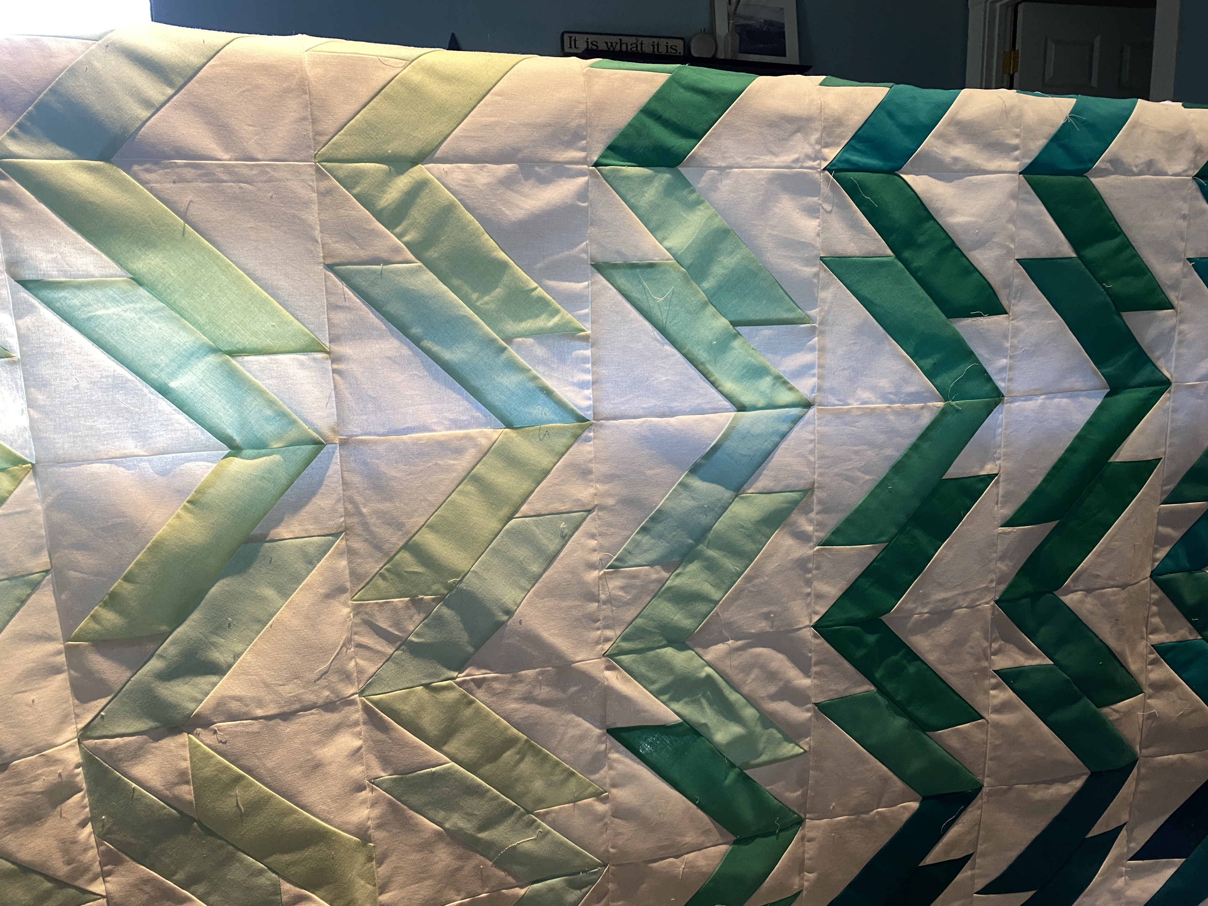Do it again, but better. A second chance for this quilt top came this week. I started it on July 24th 2021, so if I can get it quilted this week it’ll be a three year UFO project done. The problem with it wasn’t that it was put together, but that it wasn’t the quilt that matched the pattern. When I sewed the blocks, I used solid colored fabrics and white. It made cutting the triangles and rhomboid shaped pieces a lot easier to assembly-line cut, very little waste. However when I chain pieced them together, I made all 80 blocks the same, there are supposed to be 40 A blocks and 40 B blocks. They are supposed to mirror image each other, well I thought I would just make a new layout. I sewed them all together and the top sat for almost three years in the TBQ pile. I found a backing for it recently and got it all set up to finally quilt the Washboard road. My DH walked in while I was basting the top to the backing/batting and said that the design looked like a symbol from WWII. Mmm, yeah, thats what I thought too, and it had been bugging me, but I thought once I got it quilted it wouldn’t be so obvious. If my DH noticed it, then it must be pretty obvious.