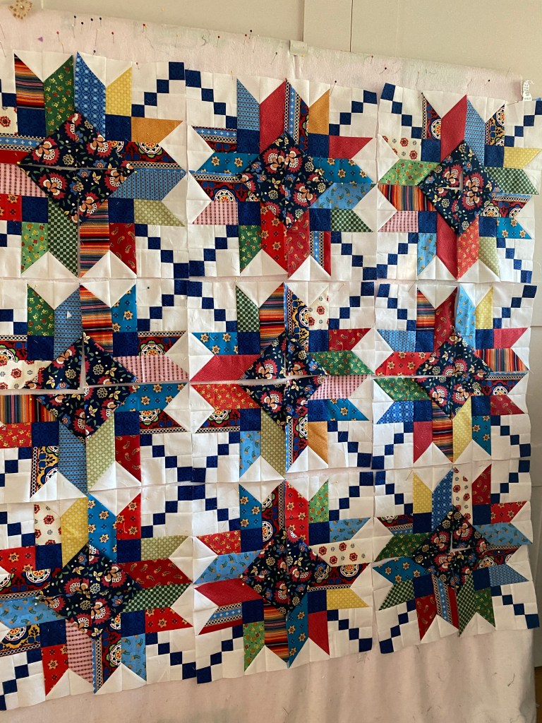 All the blocks are on the design wall, I think I have them assorted enough to not have any same ones touching. Just have to add the sashing and outer border and it’ll be a top. I was going to use the dark blue print for the sashing squares, but since I used the ones I originally cut for in the blocks, I needed to cut 49 more. I went with a mix of all the fabrics instead, yay! for scrappy.
