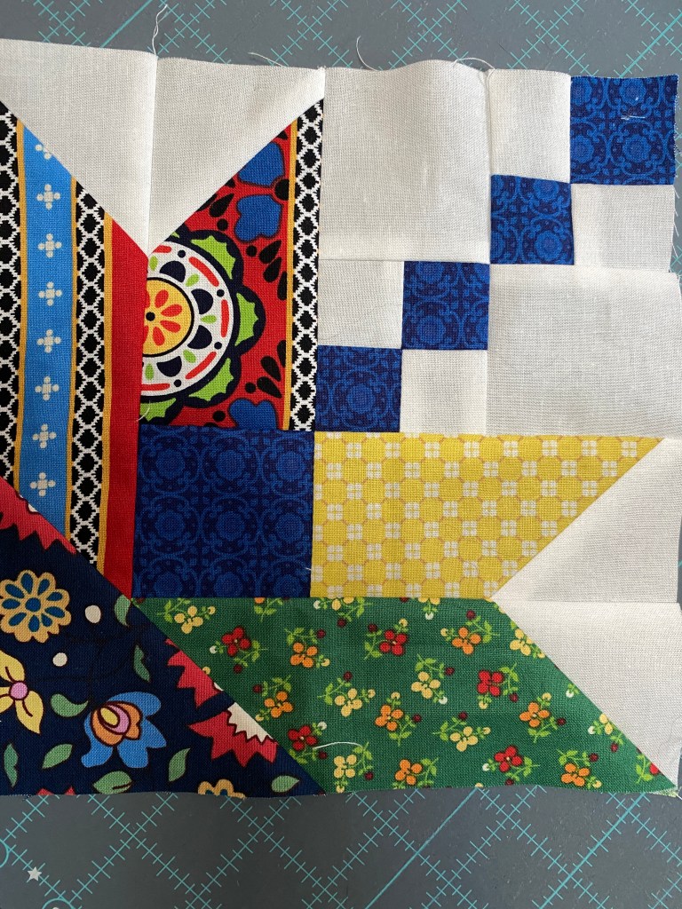 I first saw this quilt in an ad for Fat Quarter shop on Facebook. I was making the Summer Swag quilt from my El camino fabric stash and thought it would be a good pattern to use up the scraps. I found the pattern and downloaded it, it is by Chrissy Lux of Branch and Blume. Also layer cake friendly, so I knew having a bunch of scraps would work. Once I read through the pattern, I realized that it was a folded corners technique using one. I dislike folded corner blocks because they create more scraps. I re-drafted the pieces by making one block as per pattern and then carefully measuring the pieces. I then cut parallelograms instead of strips and HST’s in place of squares. I was able to get a good variety of prints and use up most of the scraps to have a few yards (total) left of the El Camino fabrics. There are 36 – 8 ½” blocks for this pattern and each block has 19 pieces. I spent a few hours cutting and the next day started chain piecing. It was all going so smoothly, until I realized I had 72 of wrongly cut chisel pieces. There may have been a few words uttered unsuitable for general audiences. Flashbacks to the Washboard quilt top too, and the hours spent re-doing those blocks. The problem here was that I couldn’t turn the pieces over and use them, as this was printed fabric, so right facing angles can’t be turned into left facing ones. My solution involved adding another piece to the block and only having to recut 36 pieces. The only seam ripping was done to the sample blocks I had made.