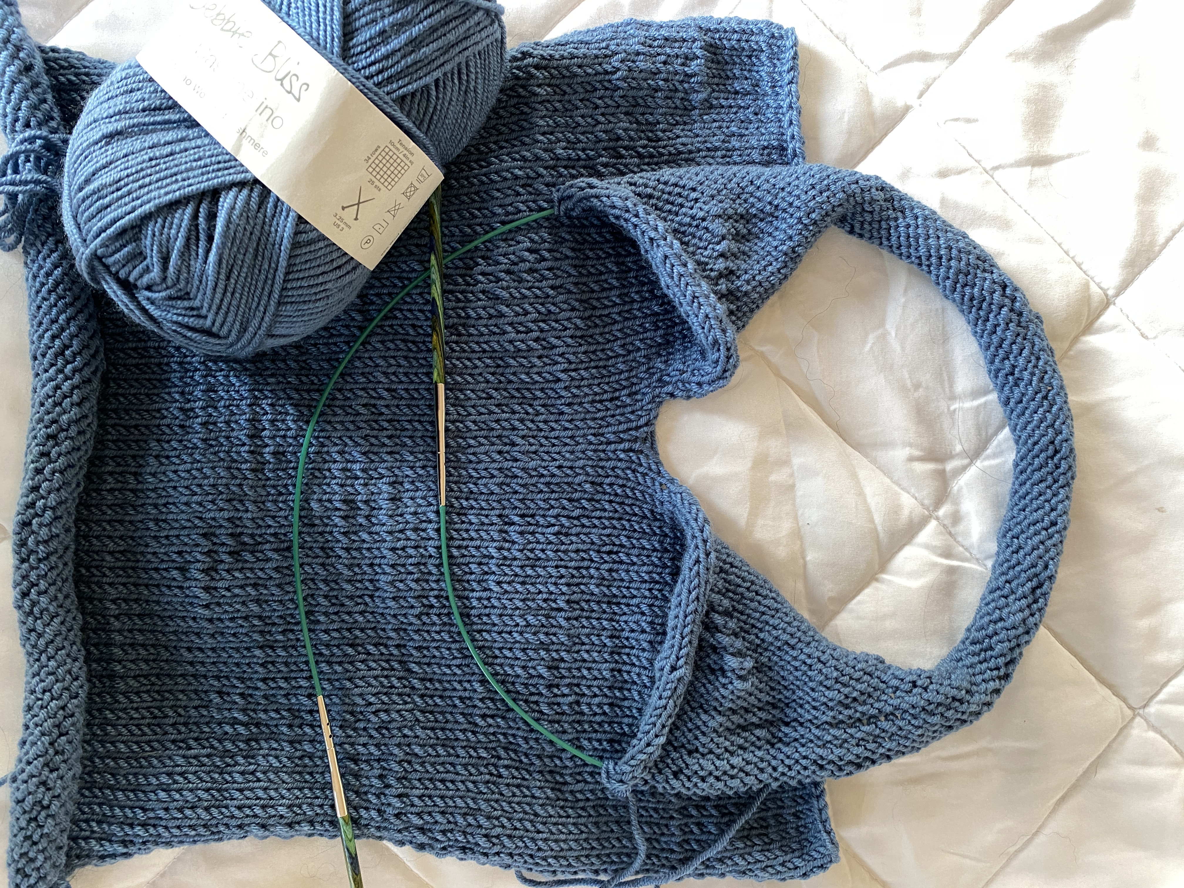 In other handwork news, I started the Light House. Lots of solid blue X’es, the whale makes up a lot of them. Other blue stitches are in the knitted Hoodie I am making. I decided to make the 9-12 month size, room to grow into. Slightly odd construction technique with this Debbie Bliss pattern. Make the flat back, make the flat front and then divide for neck. Insert a few increase stitches, bind off shoulders and keep knitting the hood. I think I may do a Crochet edging on this hood to make it a bit more feminine, and reinforce the V at the center neck.