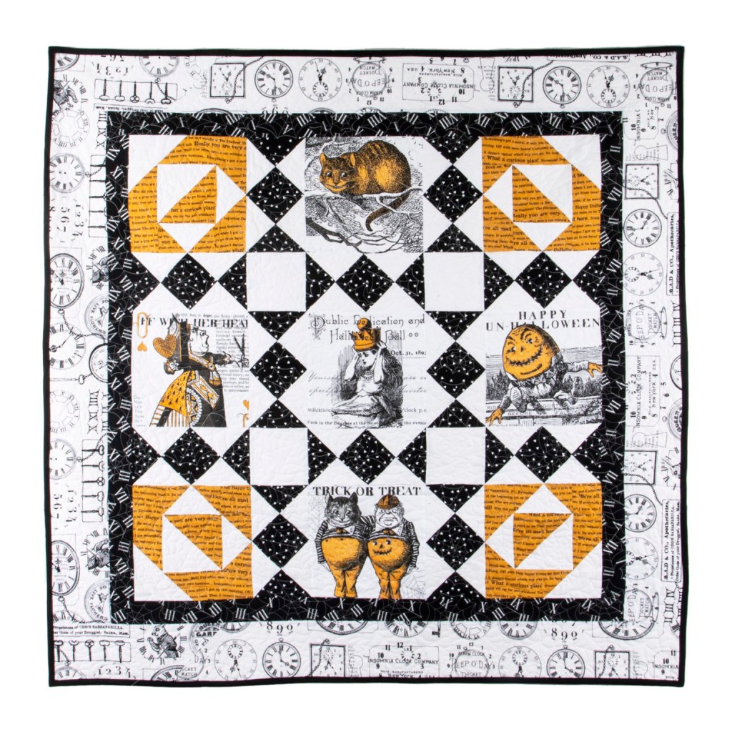 I wanted to start this quilt from (Riley Blakes free patterns page) I pulled all my Mad Masquerade fabrics together and realized I didn’t have any black prints in the line. Some shopping was accomplished and those prints will be here next week. This is a pretty simple quilt, and I was thinking I could add another row or two to make it throw sized. I have a panel of smaller “cards” that I could work into the mix of bigger prints. I like the Alice in wonderland theme, and the pictures are more true to the original book illustrations than the more modern Disn*y ones.