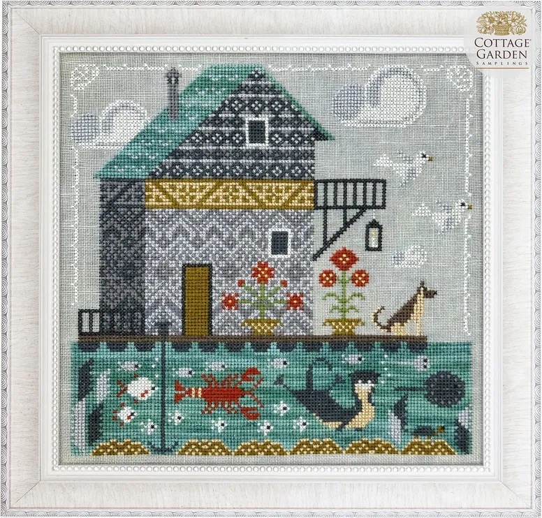 Coming through the fog of stitches, there is half of a beacon and a bit more. My goal of finishing the Light house has not been made. I’m still stitching this house, meanwhile the next house, Fairy House has been released, no pressure here, ha. I actually just ordered the floss for it Saturday, the floss colors are released before the patterns. I estimate that I am about two weeks behind, as I probably have about six more hours to complete the lighthouse. The Floating house is pretty much a full coverage piece, like the barn was, I figure ten thousand stitches. As I see it, there are 14400 in the whole square (120 x 120) and 75% of that is used, so ~10,000.