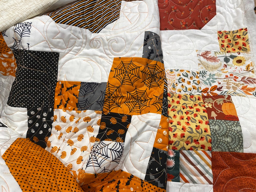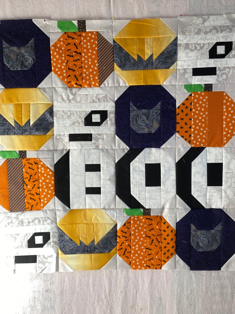 I whipped up the Halloween wall hanging in no time this weekend. Plus finished the Foliage and Fur Coats top. Got the two Pumpkin patch quilts quilted (not bound yet) and put the Falling Leaves top on the frame. I think there will be enough room on the end of its backing to add the wall hanging on to it. I was thinking of starting another fall/halloween quilt this week, but we are having company this coming weekend and there is some prep work for that needing to be done.