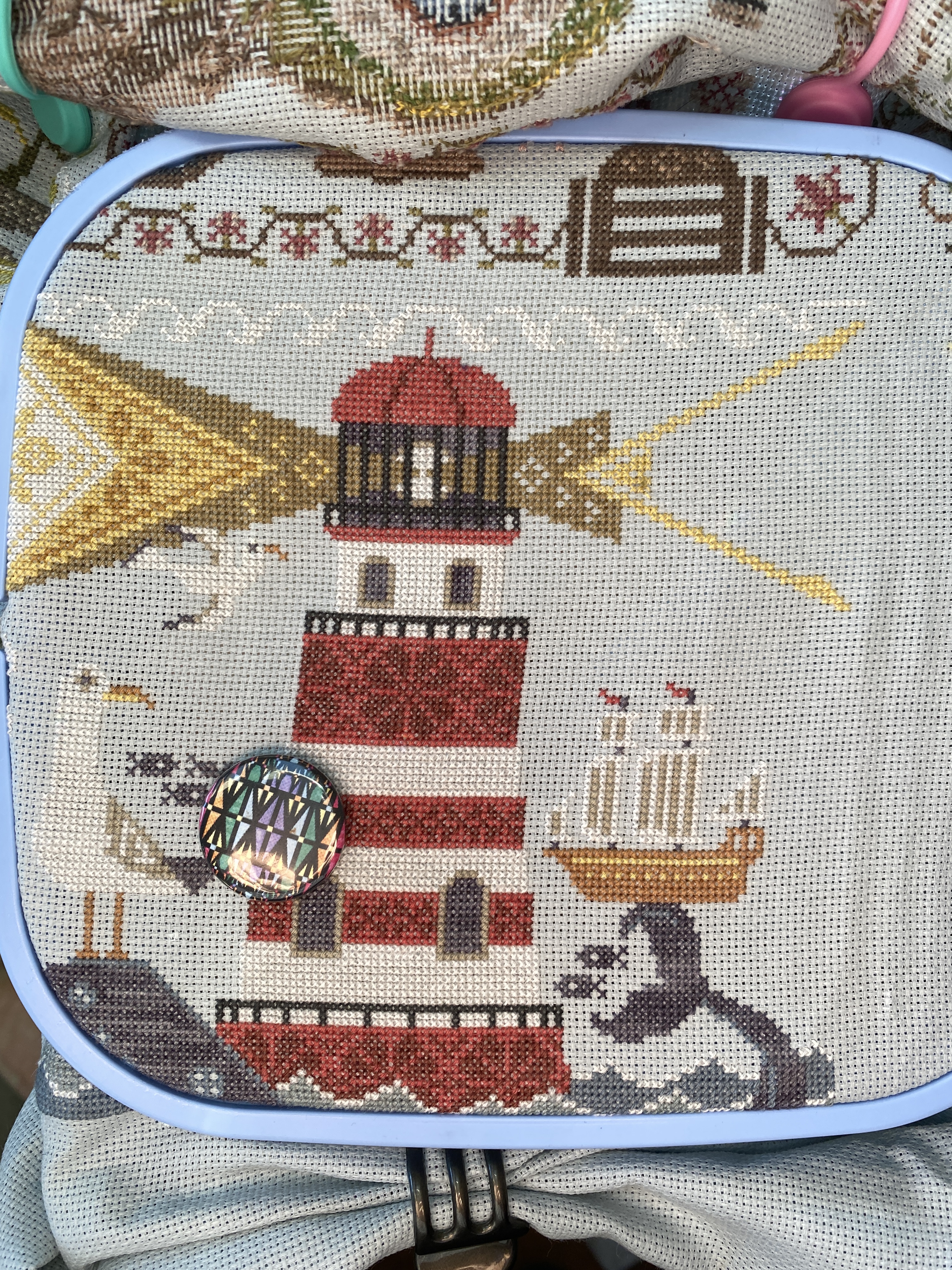 Coming through the fog of stitches, there is half of a beacon and a bit more. My goal of finishing the Light house has not been made. I’m still stitching this house, meanwhile the next house, Fairy House has been released, no pressure here, ha. I actually just ordered the floss for it Saturday, the floss colors are released before the patterns. I estimate that I am about two weeks behind, as I probably have about six more hours to complete the lighthouse. The Floating house is pretty much a full coverage piece, like the barn was, I figure ten thousand stitches. As I see it, there are 14400 in the whole square (120 x 120) and 75% of that is used, so ~10,000.