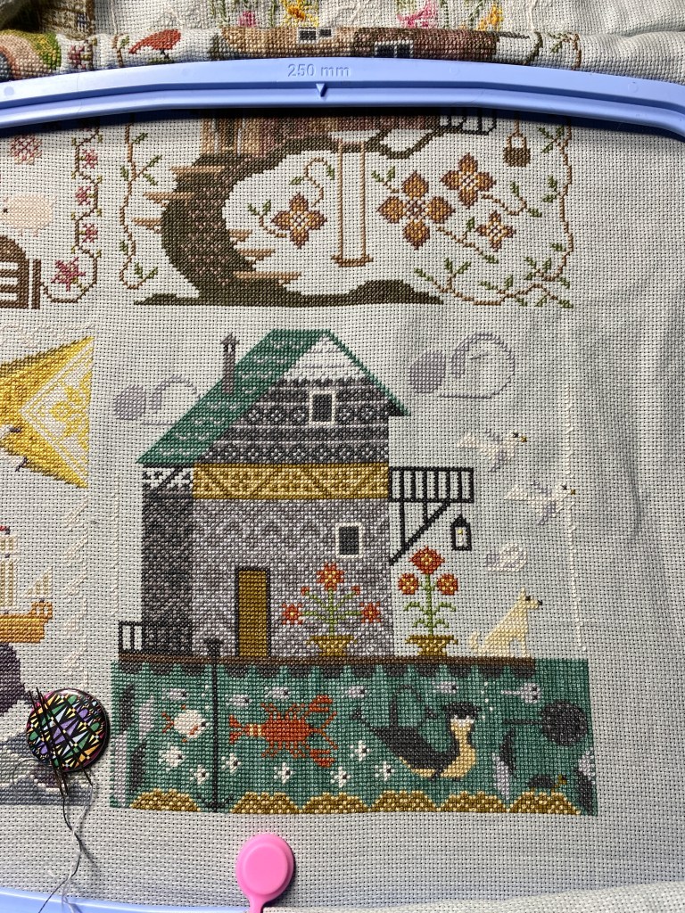My cross stitch project for this year is the Fabulous House Series by Cottage Garden Samplings . I have been mentioning complaining about it in just about every post this year. Keeping up with it is taxing to me, it’s not a race, or even a contest, it has become a personal goal. I feel like I am never going to finish this piece, is the “thrill” gone? This year is the first in a long time that I have not done a BOM quilt, I do have two to finish from previous years and the reunion quilt has yet to be quilted, I digress. Anyway, what is my problem here? I am stubborn, I signed up for this cross stitch SAL and even belong to a Facebook group. There is not much going on there though, 1.6K members, and only one has posted a finish of the most recent house. Not shaming any one either, but if I were the designer of these houses, I think I’d be sad, because everyone starts these SALs with such enthusiasm, then reality and life happens. Squirrels too, don’t forget the squirrels. I am stubbornly refusing to quit this one, even if it takes me four more months to finish.
