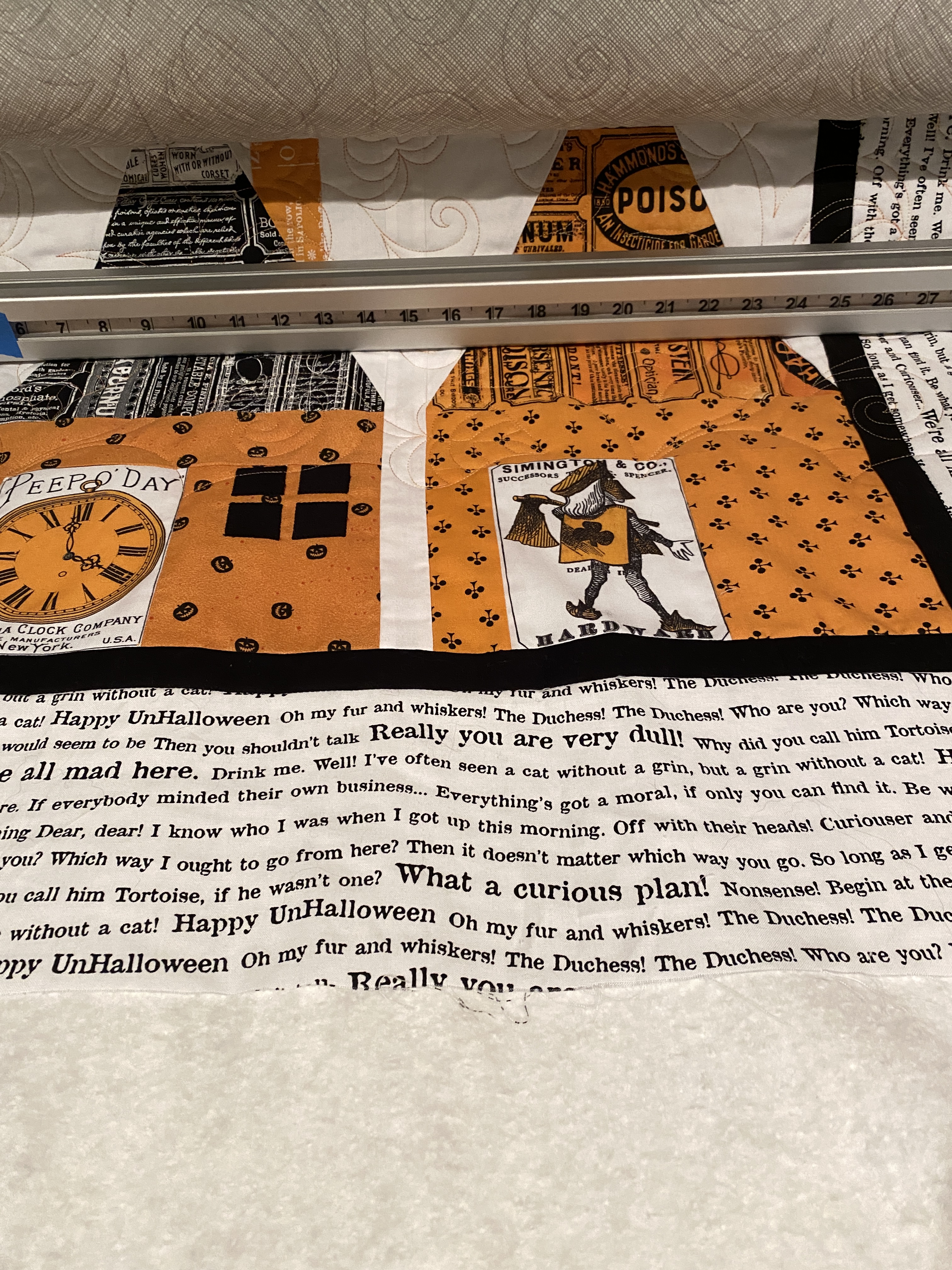 Getting back to my Halloween quilting is easier now. I popped the Chill Cabin top on and need one more row to get this one finished. I am hoping to get it in the store and sold in the next week or so. I managed to get the other one in earlier this week, might be a little late. The two pumpkin quilts I made earlier this season sold and had over 150 views. Probably the most ever for one of my quilts. I will admit that these Mad Masquerade fabric quilts aren’t as mainstream, but there are J Wecker Frisch fans out there, besides me (I hope).