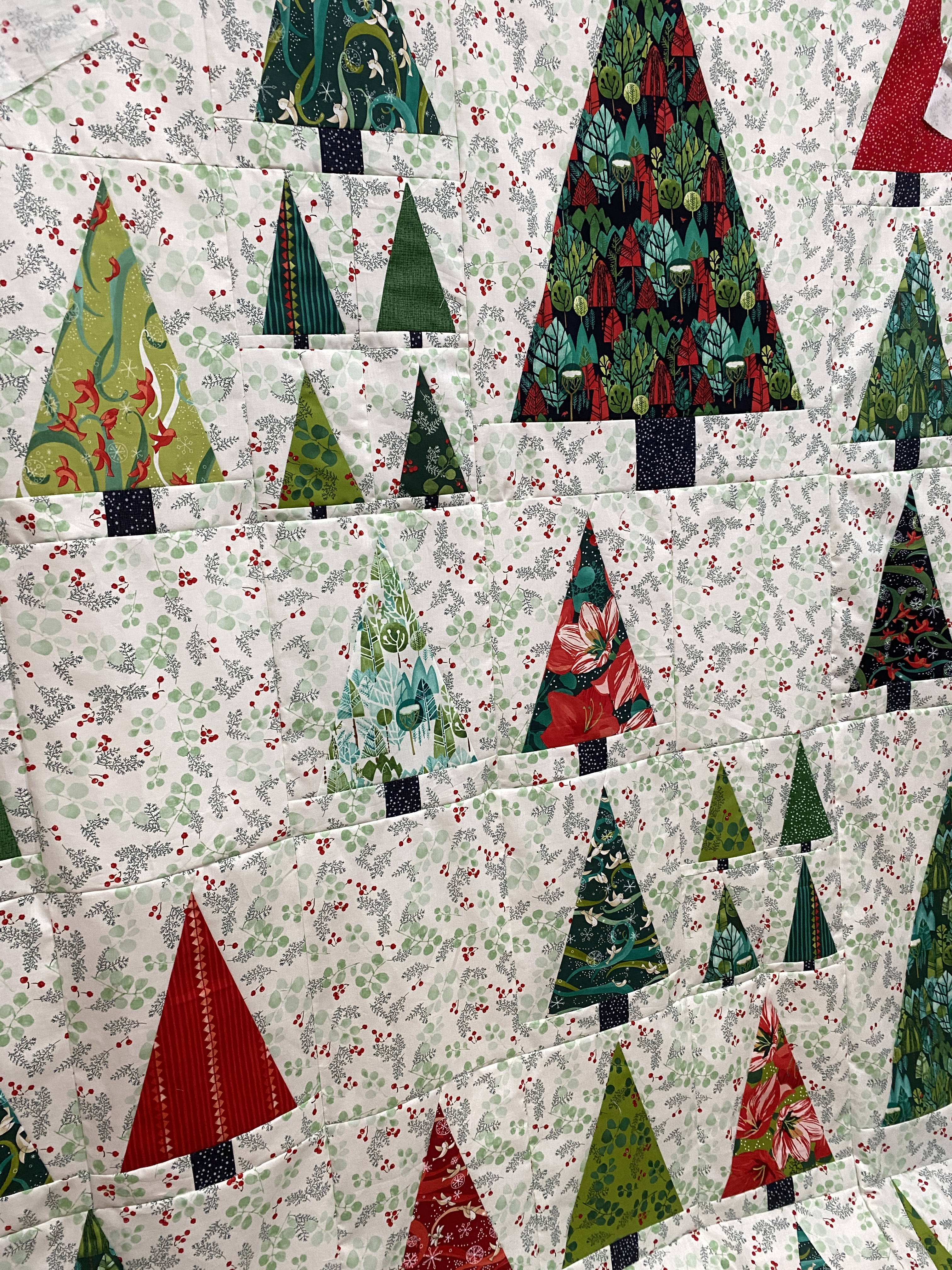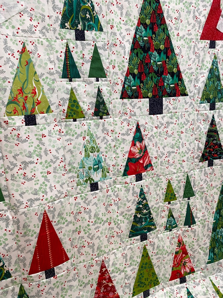 Four of the five quilt tops I am constructing are made with tree blocks. Plus I made a table runner with three trees from the scraps. This last one “Arboreal” is going together quickly. The blocks are large, the really big trees are 24″ tall, but I like how the fabric designs really show off. I was a little hesitant to use the white mistletoe print for the background, but I think it works well. These blocks are made with the stitch and flip method, and once I got everything cut, assembly line sewing was enacted. I am hoping to get this top together today. Also today, I want to get a few more rows done on the Courtyard Lattice quilt. Unfortunately there is some house cleaning that needs to be done, and then tomorrow there is meal prep for Thursdays feast.