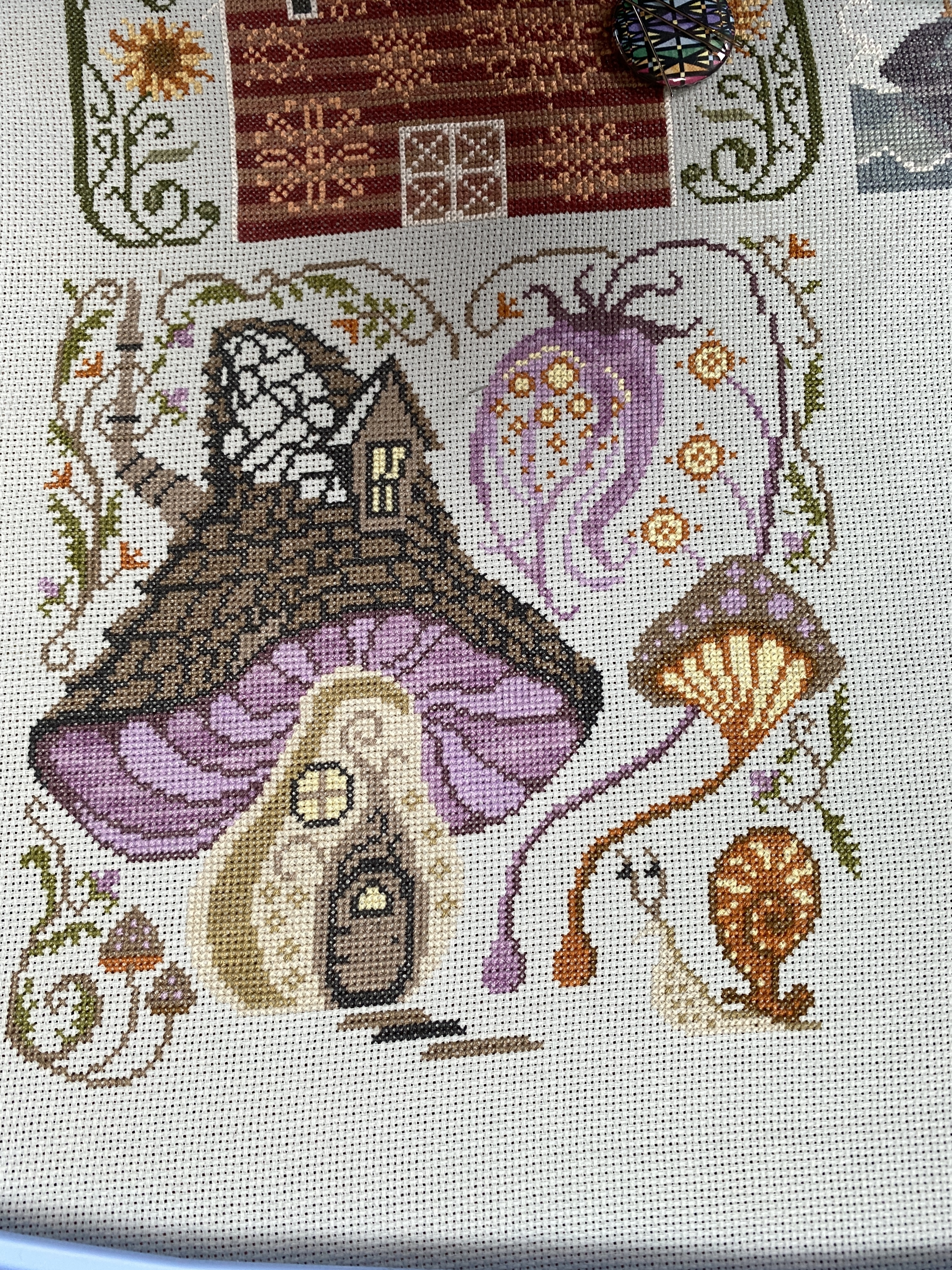 I really thought that I was going to finish the Fairy house last night. I finished outlining the tip of the roof Sunday, and figured I would cruise through the fill areas. When I sat down and looked there were still a bunch of vines and leaves that needed to be stitched. I concentrated on them instead, so maybe I’ll get it done this evening. I am thinking of taking a bit of a slow-down break from cross stitching this month. I have not been looking forward to the next house, the Haunted house, and this Fairy mushroom is taking a long while. I want to get my knitting projects finished too. Those Christmas hats won’t knit themselves.