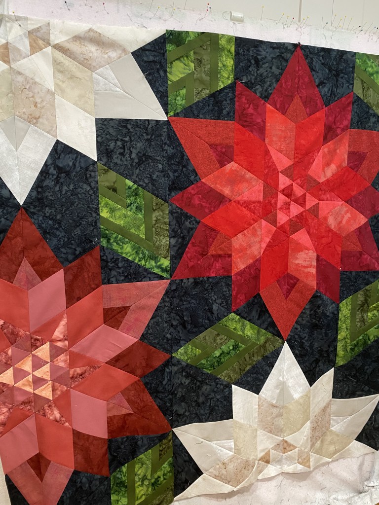 This is a quick post. I am heading out for a few days, but in getting ready for this mini break, I have been stitching like a mad (not angry) person. On Friday I got the binding done on two of the tree quilts, started a new knit hat, and made a backing for tree quilt number three, LBQ Holiday Forest, and the diamond Creative Grids ruler arrived. Saturday I got the rest of the pieces cut and organized for the Poinsettia quilt, tried to get a start on the last tree quilt (need another triangle ruler- amazon to the rescue) and got the Holiday Forest top on the frame. Sunday, I finally finished the Fairy House, and got a few rows of long arming done, and more hat knitting. I pieced the Crimson Christmas poinsettia quilt so that when I get back I’ll able to get it quilted and gifted. Monday was a whirl wind of knitting while the long arm did its thing, and I managed to finish one hat, and make some headway on the other. Plus I seamed up the booties I have been knitting on the side. I only bought two things for Cyber Monday, tack cleaning sponges and envelopes. I am planning on making mesh bags with two or three sponges in them for my Barn mates. Last year I made them all little zippered bags for dog poo pick-up bags. There are a few less people this year, I think twelve. My bags will be based on a pattern from SewThankful.com . I need to check and see how much poly netting I have and the toggle thingies.