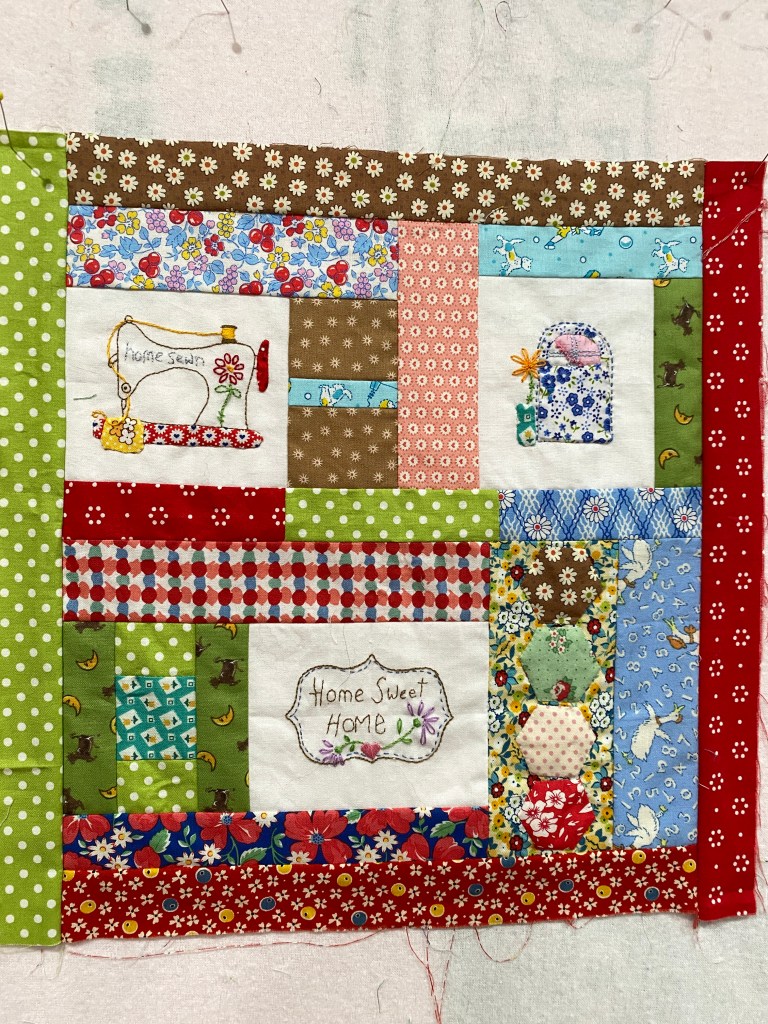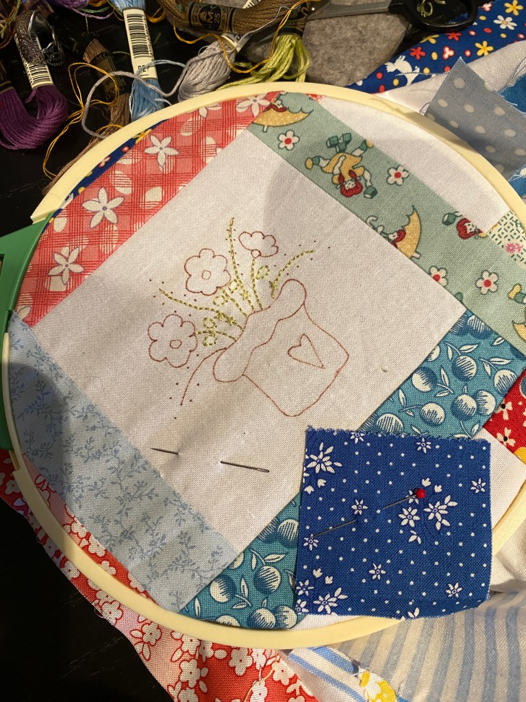 I did decide to do another BOM, I have no business starting another Elefantz one, but I am. The new one is The Sewing Room and it is simple embroideries and patchwork. It did make me pull out the Simple Days blocks, and while the long arm was doing its thing, I finished block 8 and started block 9. Last summer I had sewn them together and had them all ready to finish, but didn’t. It’d be good to check this of the UFO white board. I am going to take the Tilda quilt with me on vacation, so that leaves the Message in a Bottle quilt to languish.