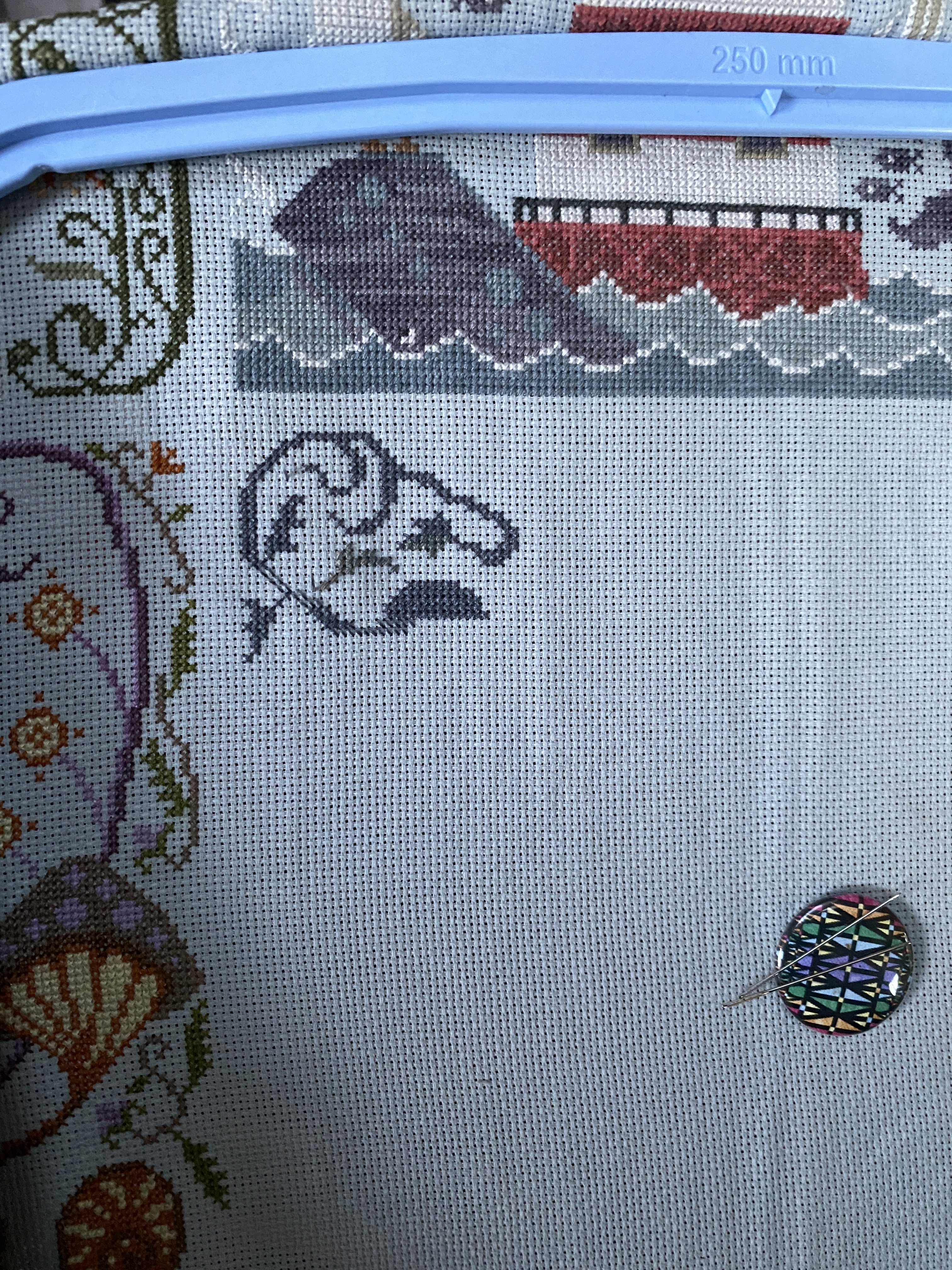 I did decide to do another BOM, I have no business starting another Elefantz one, but I am. The new one is The Sewing Room and it is simple embroideries and patchwork. It did make me pull out the Simple Days blocks, and while the long arm was doing its thing, I finished block 8 and started block 9. Last summer I had sewn them together and had them all ready to finish, but didn’t. It’d be good to check this of the UFO white board. I am going to take the Tilda quilt with me on vacation, so that leaves the Message in a Bottle quilt to languish.