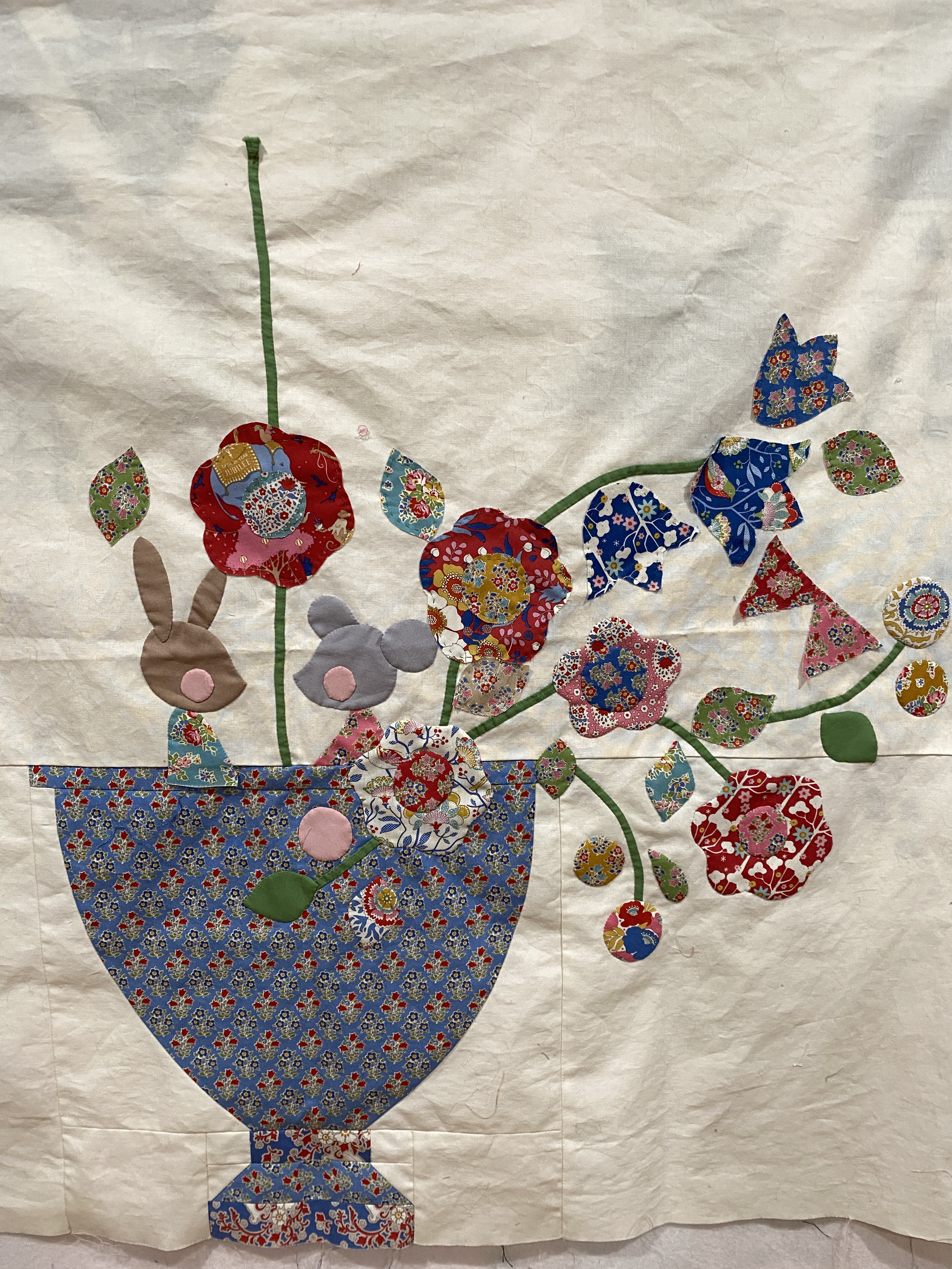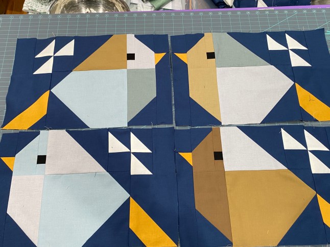 Off site, I got a chance to work on the Tilda appliqué quilt top. Before I left, I basted about 20 pieces to it, that way I could stitch a few on at a sitting. Plus I only had to bring the top, thread needles and scissors. I had some time for a little shopping, I got a few more patterns and a commission project. I have made a bunny from Julie Williams Little Cotton Rabbits patterns a while back, probably close to 10 years (yikes) ago. I really enjoyed making the piebald one and a little sweater for it. I got the fox/deer pattern and the horse pattern. These patterns are well written and many-stepped, but the resulting stuffies are worth the effort. The commission project is for four bench pillows, a few days sewing. I did a little fabric shopping too, I want to make a bed sized Sparrow quilt. The throw size one I made a few years ago, sold quickly, I had briefly wanted keep it for myself. Although it’s a relatively easy block to make, I hadn’t felt the need to make another until I saw the cutting sheet for the bigger one. The pattern is from Pen and Paper Patterns and lucky me, there was a sale on Bella solids at 123stitch.com. I generally used to buy only thread and cross stitch supplies from them, but they have a relatively large fabric selection and notions too.