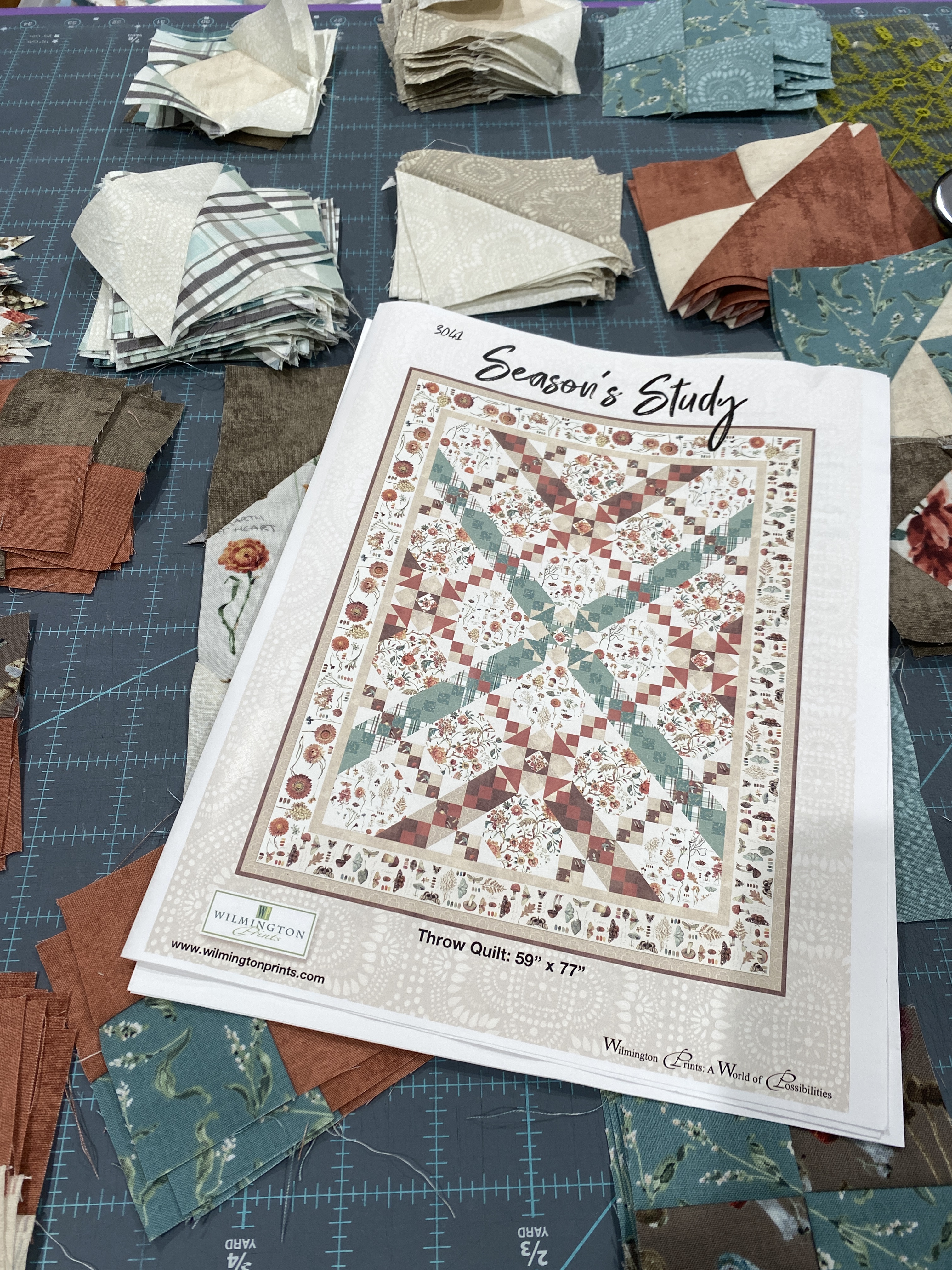 The winter village quilting is finished, still needs binding. I would do it today, but my current project, Seasons Study is taking up all the work surface. The last two days have been spent making blocks and pieces for this kit. I really like the prints, flowers and mushrooms and forest-y things like twigs and cones. The pop of teal is nice too. The kit had plenty of fabric, so there may be a throw made with the scraps. The kit came with border fabric long enough to not have to piece the four outer borders, and the border print repeats eight times. There are cats cradle, four patches, HSTs, and snowball blocks in this pattern. Today I am hoping to get the larger units together.