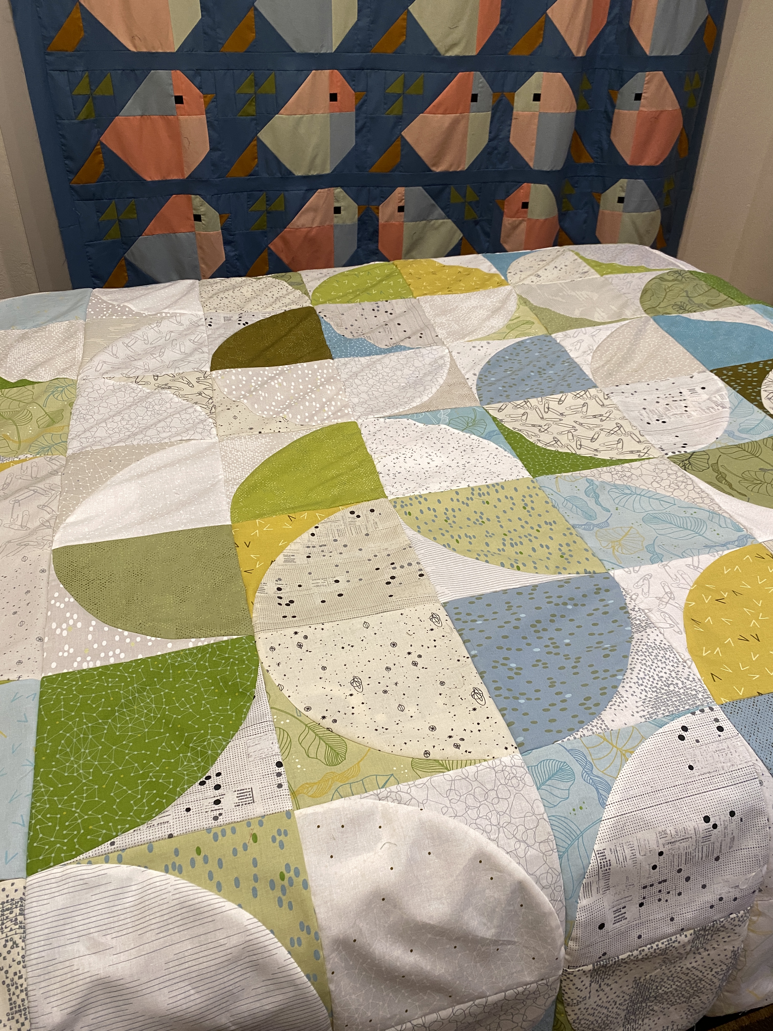 I found a nice backing for the Sparrow quilt on sale and I’m waiting for it to be delivered. I ordered three backings, the other two are for the Ellipse quilt and Seasons study. I got the Eclipse quilt top together this week too, it needs ironing/pressing. This pattern was relatively easy and if you are proficient at sewing curves a quick project. There is also very little waste in cutting and squaring up the blocks. I used two 10″ square layer cakes and had two left over blocks. The scraps from the initial cutting of the arcs were not even a good string size piece.