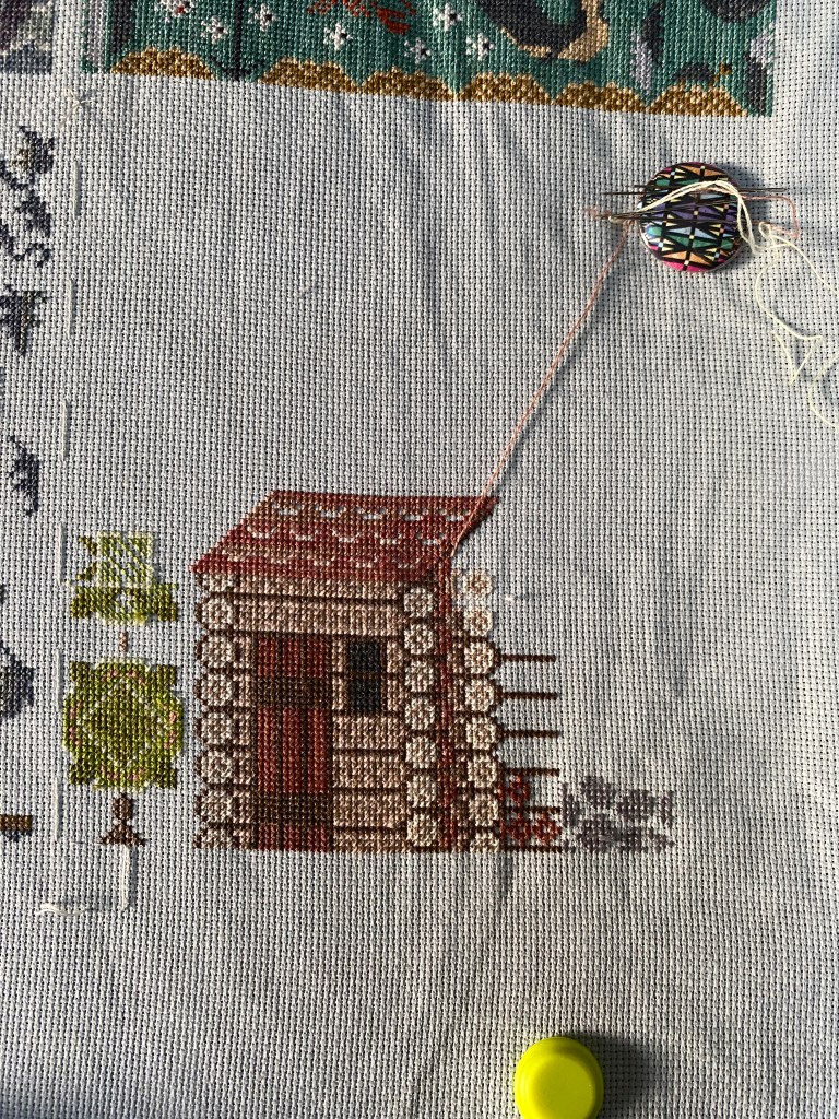 I finished the Manor house cross stitch and got it sent to the recipient. I was sorry that I didn’t have time to frame/finish it properly. I stitched the simple border in a backstitch using a gold-ish brass floss, I imagined a matting and narrow black molding for framing. I’m curious to see how it turns out. I am back to stitching the Fabulous Houses again, making headway on the cabin. There are lots of details in the logs, with color changes a plenty.