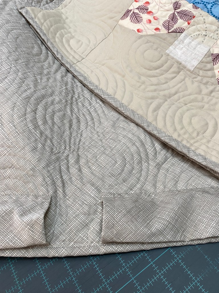 The X&+ quilt is finished too, got the hanging sleeve sewn on yesterday. It’s all ready to ship out today, well after I pack it up. I made a two part sleeve with an open section in the center to accommodate the “hang-it” self leveling magnetic hanger I got for it. I really like this hanger, as it is really easy to install, one screw and as the name implies, it self levels. As long as the quilt is square, (ahem) it looks good on the wall.