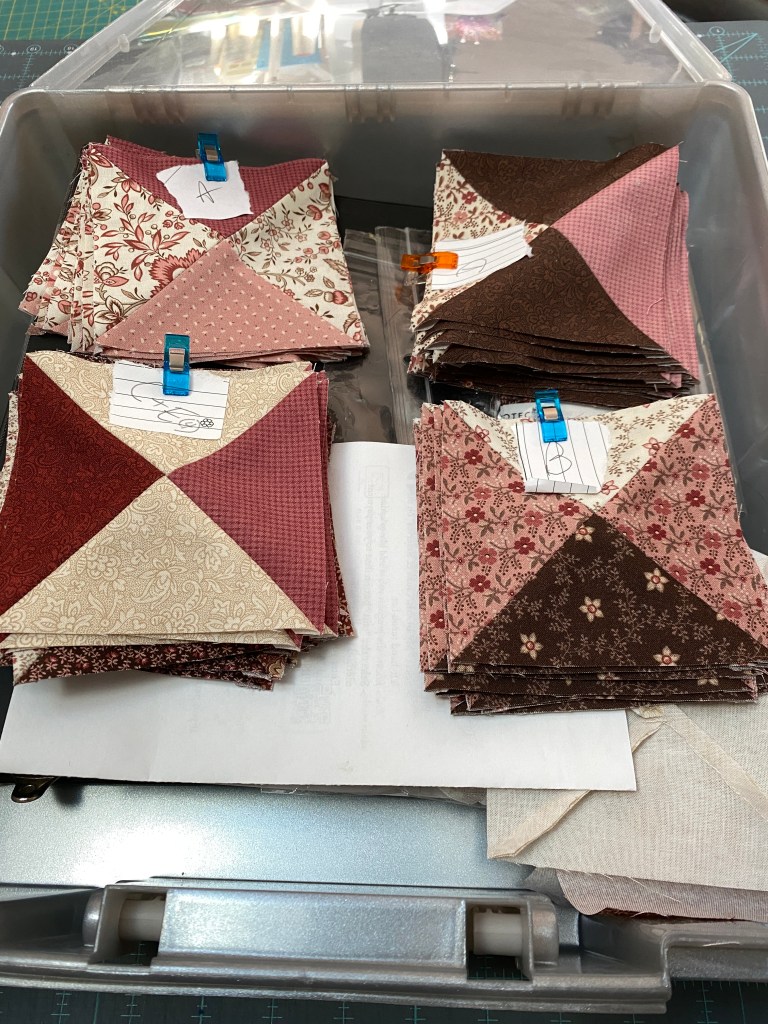 I made my Starry Skies block and got the moon block from the center panel done. I made it with a gray ombre, rather than the yellow gold, I want my stars to shine. I have the center stars yet to do, but I put everything away after the moon block. I plan on doing one or two when each new star block is released. Speaking of BOMs, I made the 60 or so block pieces (Feb March ) for the Blooming Beauties quilt. They are in their own designated art bin box waiting for the next installment.