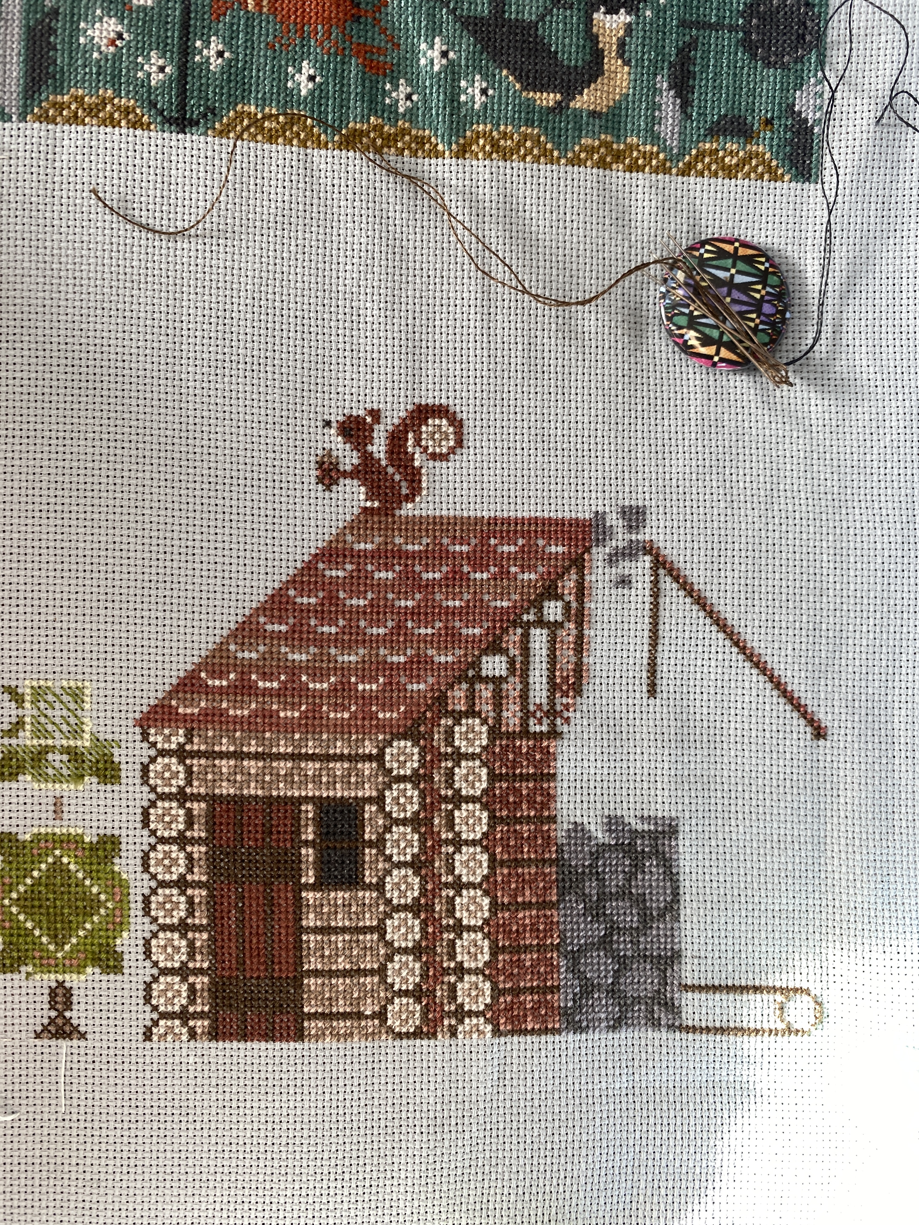 The log cabin is logging many stitches. I want to finish this, soon, I really want to move on to something else. The squirrel was fun to stitch, I may start the moose that goes in the top right corner. All the green tree things are intense with many color changes. I am thinking I may change one of the green shades to a lighter one, as it is very close in value to the others. Thus the pattern is lost and blurry. If you look at the finished picture there is more color difference, in my first green square (lower left) there isn’t much.