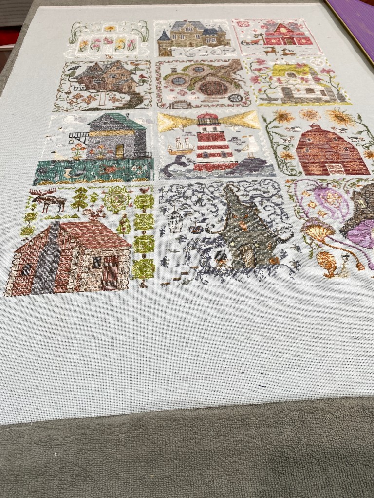 The fabulous houses piece was finished and I set about ironing it. I was trying to iron it dry, as some of the floss I used wasn’t colorfast. Most of the creases were flattened, but others were still visible. I ended up using my large rotary cutting board as a weight on top of the piece. I lay down a thin towel, then the cross stitch – face down, then put my mat on top of it. I was reminded of how Jack Reacher would carefully press his trousers in between the mattresses of his bed. I peeked at it, and it seems to be working. I am back to stitching on the Consider the Lillies piece. It is a bit more fun for me, as I can usually complete a motif in an hour or two. It was a bit of a mind re-set going back to linen from Aida cloth.