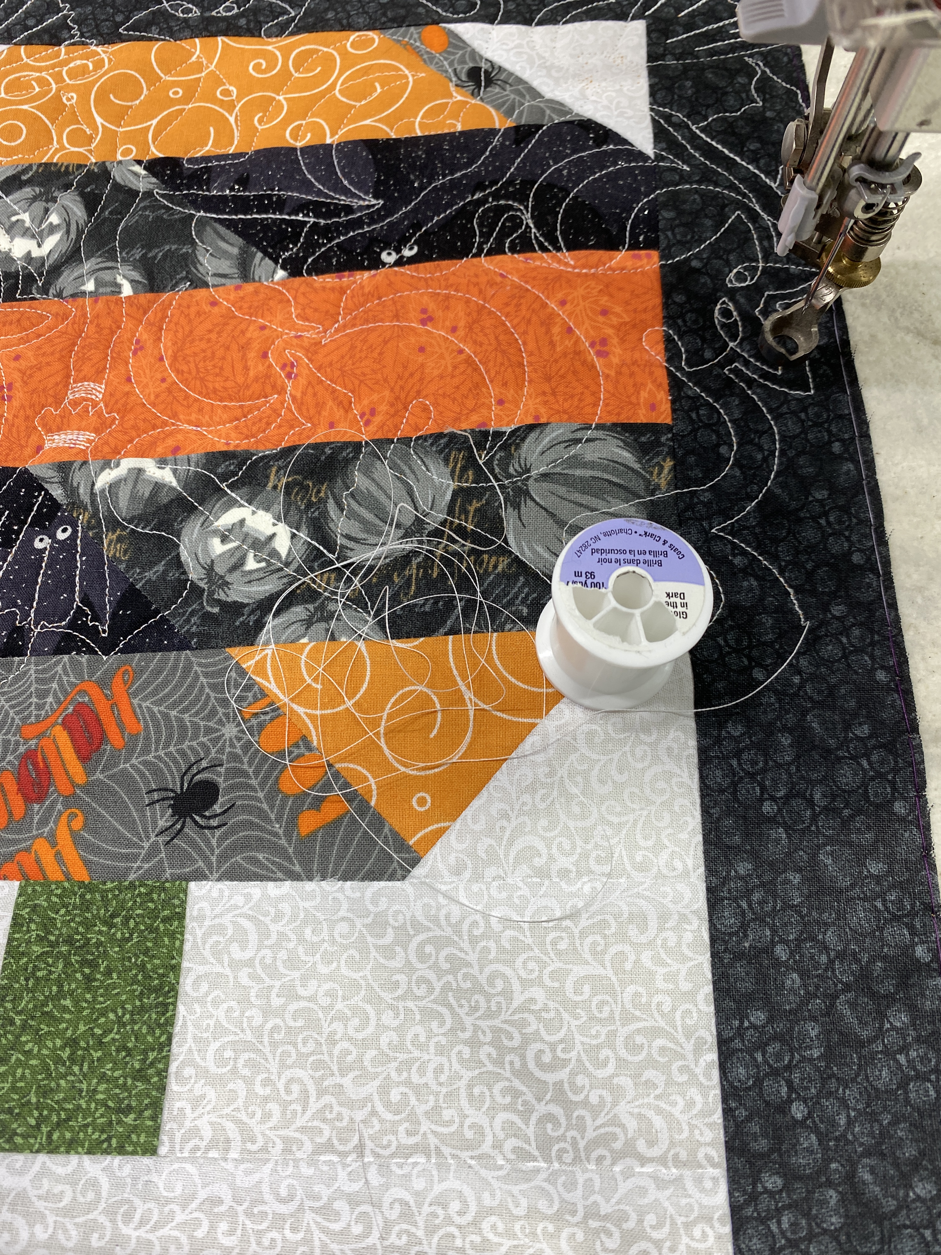 I had an idea for the last Pumpkin runner – glow in the dark thread. I had bought a spool for a machine embroidery project that didn’t get sewn, and my client was happy with the choice. I set about sewing the first row (of two) of the panto out. I won at thread chicken, but I needed another spool to do the second row. Apparently this panto is 99 yards of thread long. I tried to order another from the original vendor, but there was an issue with the credit card so it has been delayed. I ended up ordering another from Amazon, which should be here Wednesday. I am hoping to get these finished and out the door by Friday.