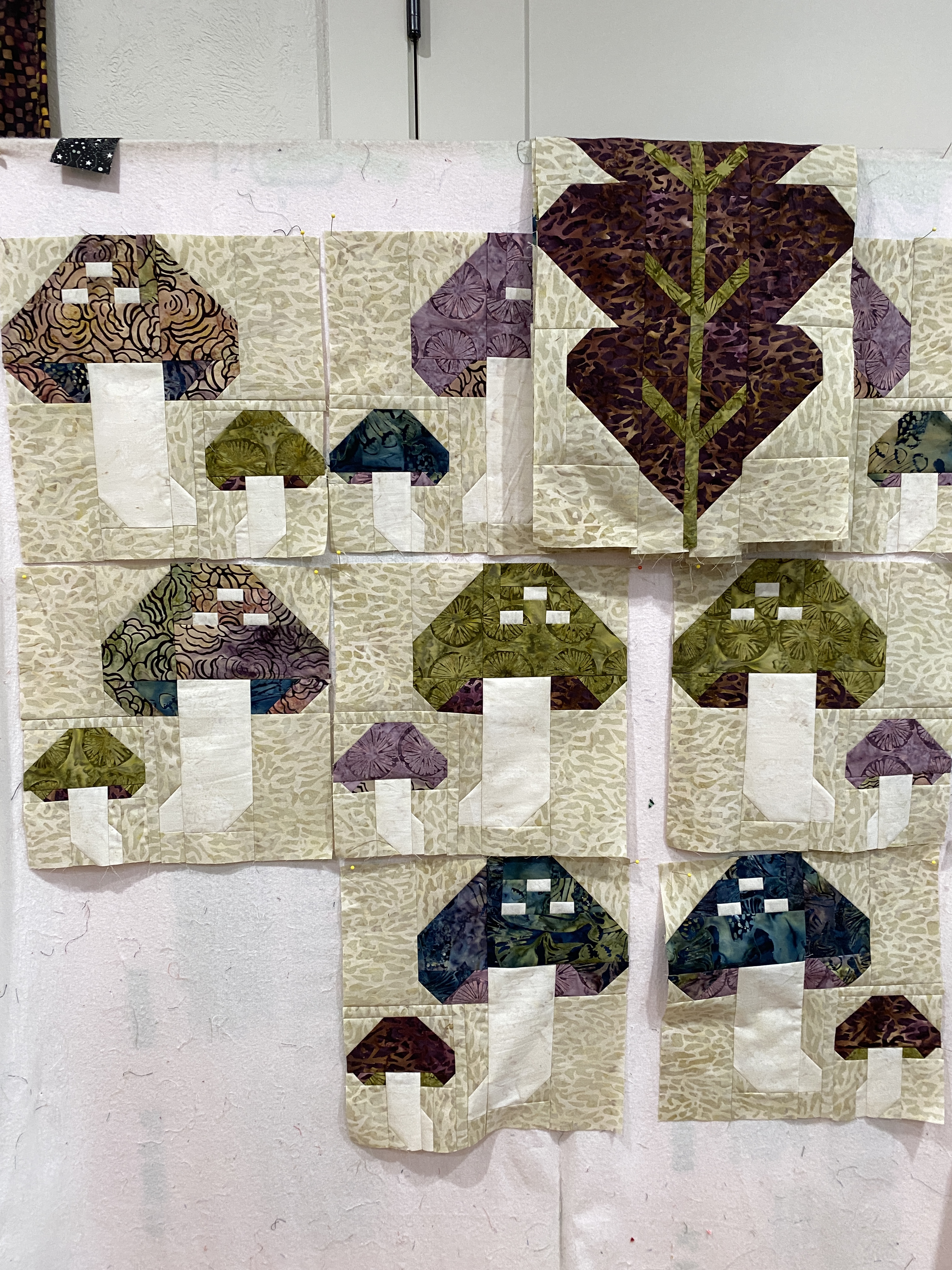 The past three days I have been working on the Forest Fungi quilt top. Cut all the pieces the first day, made the oak leaves the second, and put together eight of the ten mushroom blocks. I was trying to do all the mushrooms at once, but it got confusing with the all colors, and that half the blocks are mirror image. The hardest part, for me, was piecing the ‘gills’ of the mushroom. I ended up doing two at a time, the color combo is the same, just one set is mirrored.