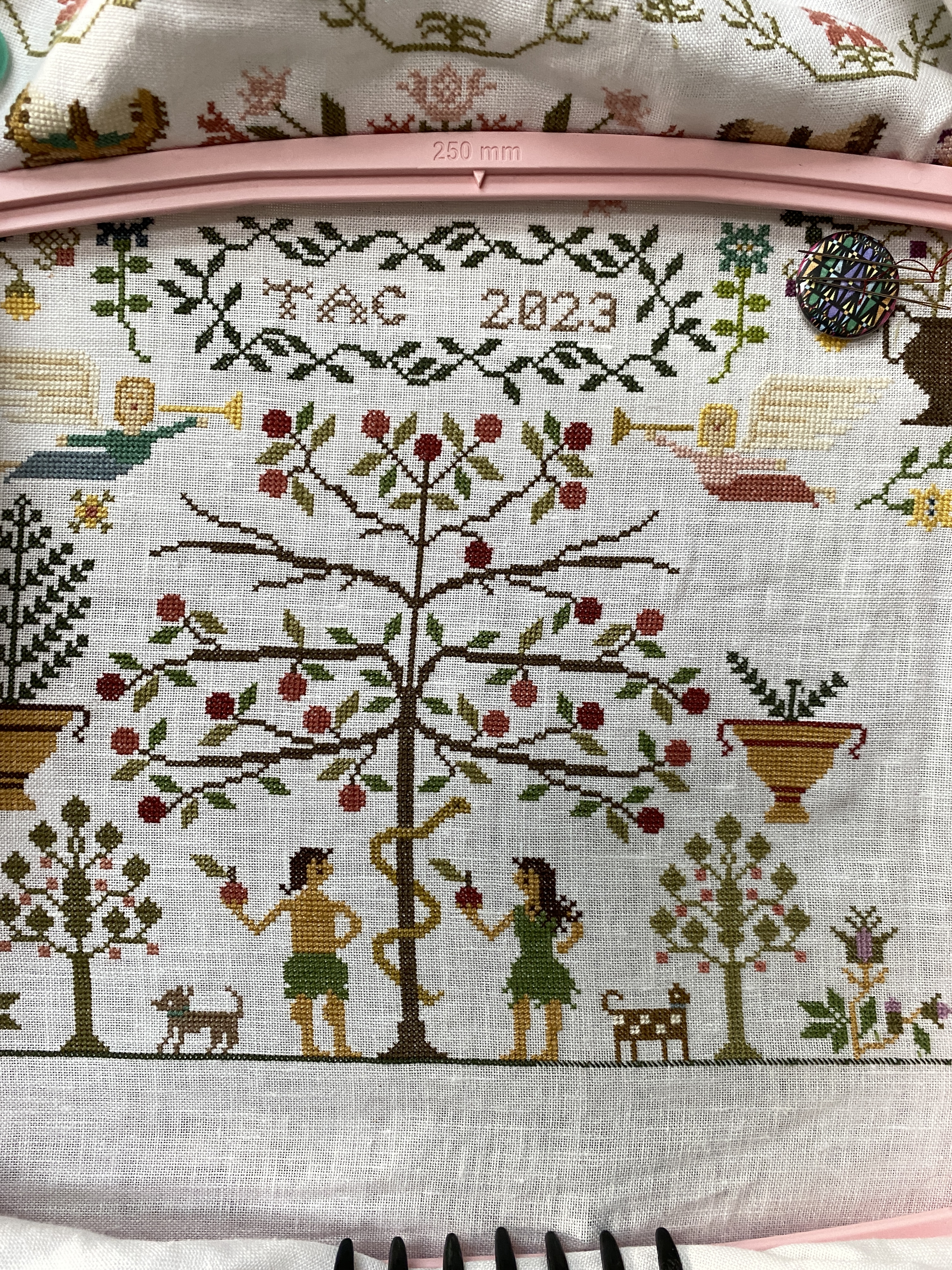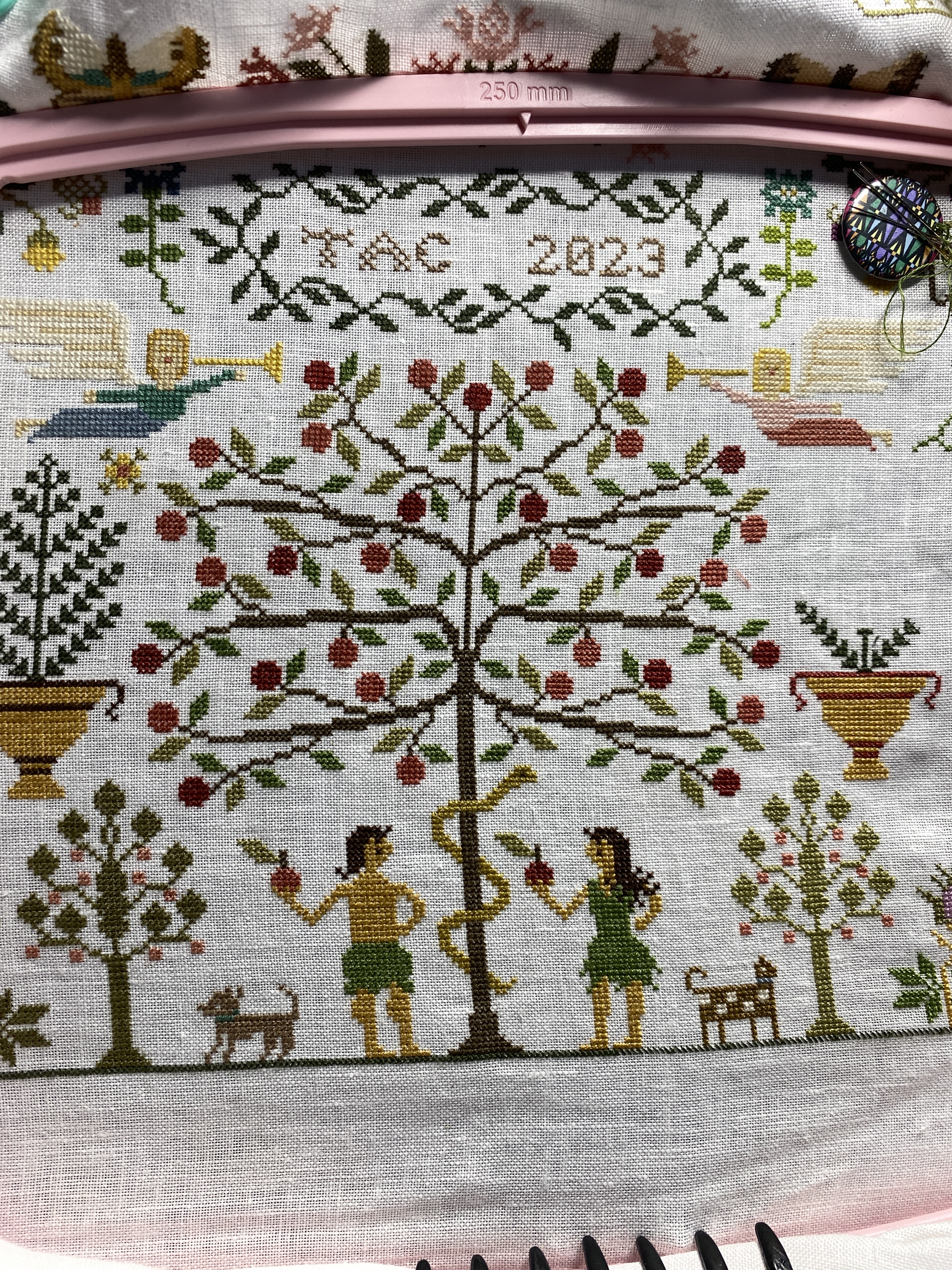 I have been stitching on the Consider the Lillies piece every day now. I sort of like the color changing and smaller sized motifs, I can stitch a few different ones each day and mix it up a bit. Finishing the center tree was milestone, I am on the sixth page now, the right side. I think I have to print the next row of pattern sheets out.