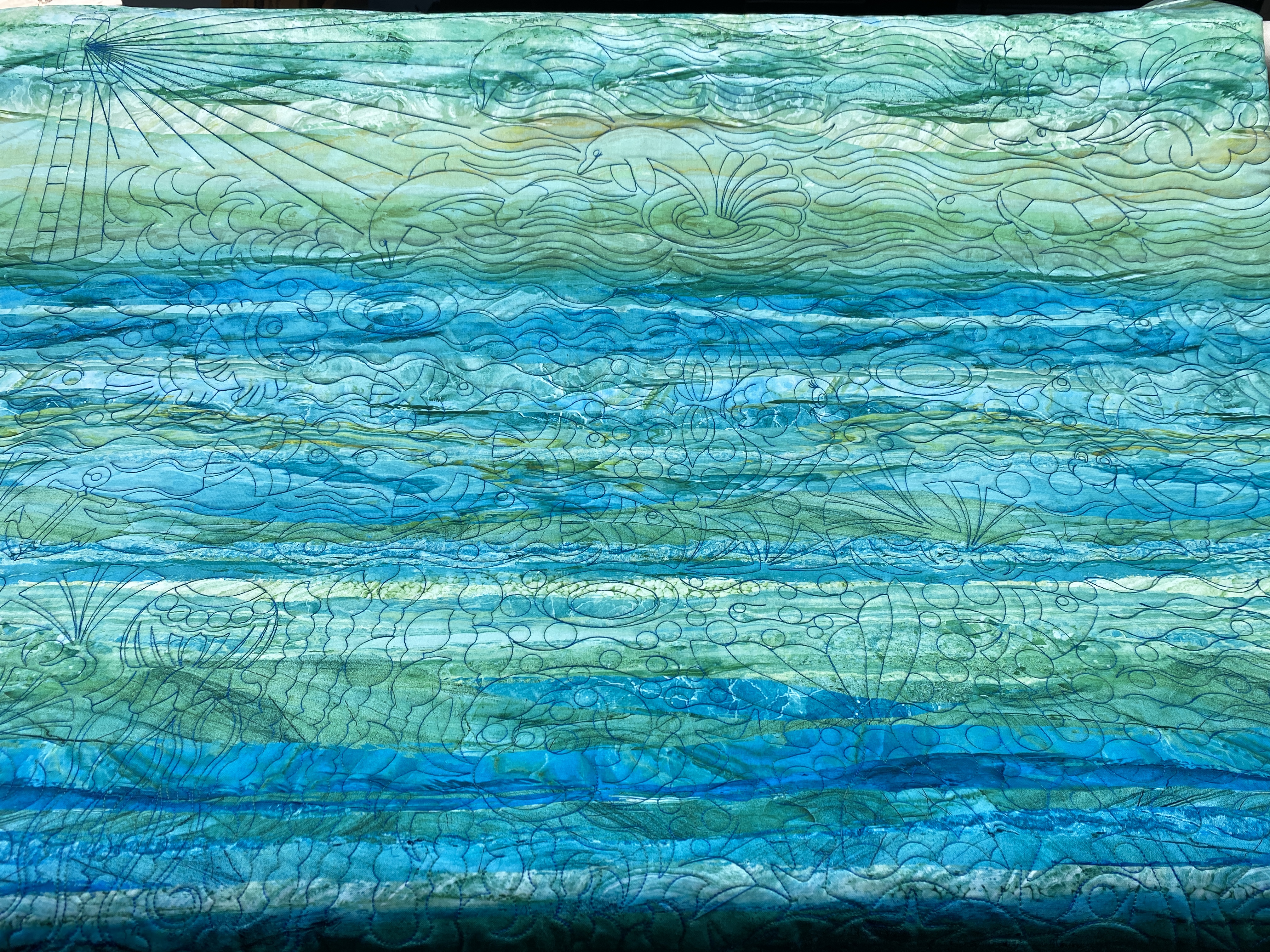 Just a final note on the Glow in the dark thread experiment used for the last runner quilting. The spools were small, 100 yards each, I had just enough to stitch one row on the panto. I used my choice, universal 100 chrome needles to stitch with no trouble. Then I ordered another spool, which ended up being delayed, so I ordered another one from Jeff B. That one came in the mail first, so I thought I would be finishing the second and final row of quilting. Wouldn’t you know I was about two yards short? Then I had to wait three more days until the first ordered spool arrived. I really thought about just using some white thread to finish the tiny bit that was left – no one would notice. I was patient, and finished the runner. The seven of them are packed up and awaiting shipment tomorrow.