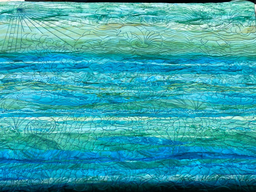 This little quilt went together very quickly, no piecing and I even used a precut crib batting. I experimented with using a different needle on the long arm for this one. I normally use Universal chrome plate #100 needles from Schmetz. They usually work very well for me, I occasionally will switch up to a 110, but the 100s seem to do the job with the thicker #40 threads and the thinner poly-threads. Bernina has a Youtube video about picking the right needle for the job on their web site. After watching it I decided to experiment. My results were mixed, I tried to use their recommended Jeans #100 needle with a 40 wt poly thread for this project. I ended up switching back to the universal 110. There weren’t a lot of skipped stitches, but random toe catchers of an inch or more. Plus shredding at the needle with the jeans. These problems were alleviated somewhat when I added a healthy dose of thread lubricant to the thread path. Maybe it was my thread being too dry? Anyway the jury is still out on the Jeans needle. I got the last of the runners done and bound, and the Fungi quilt is on the frame and read to go today. I really want to get this quilt done this week, as my vacation is looming on the calendar.