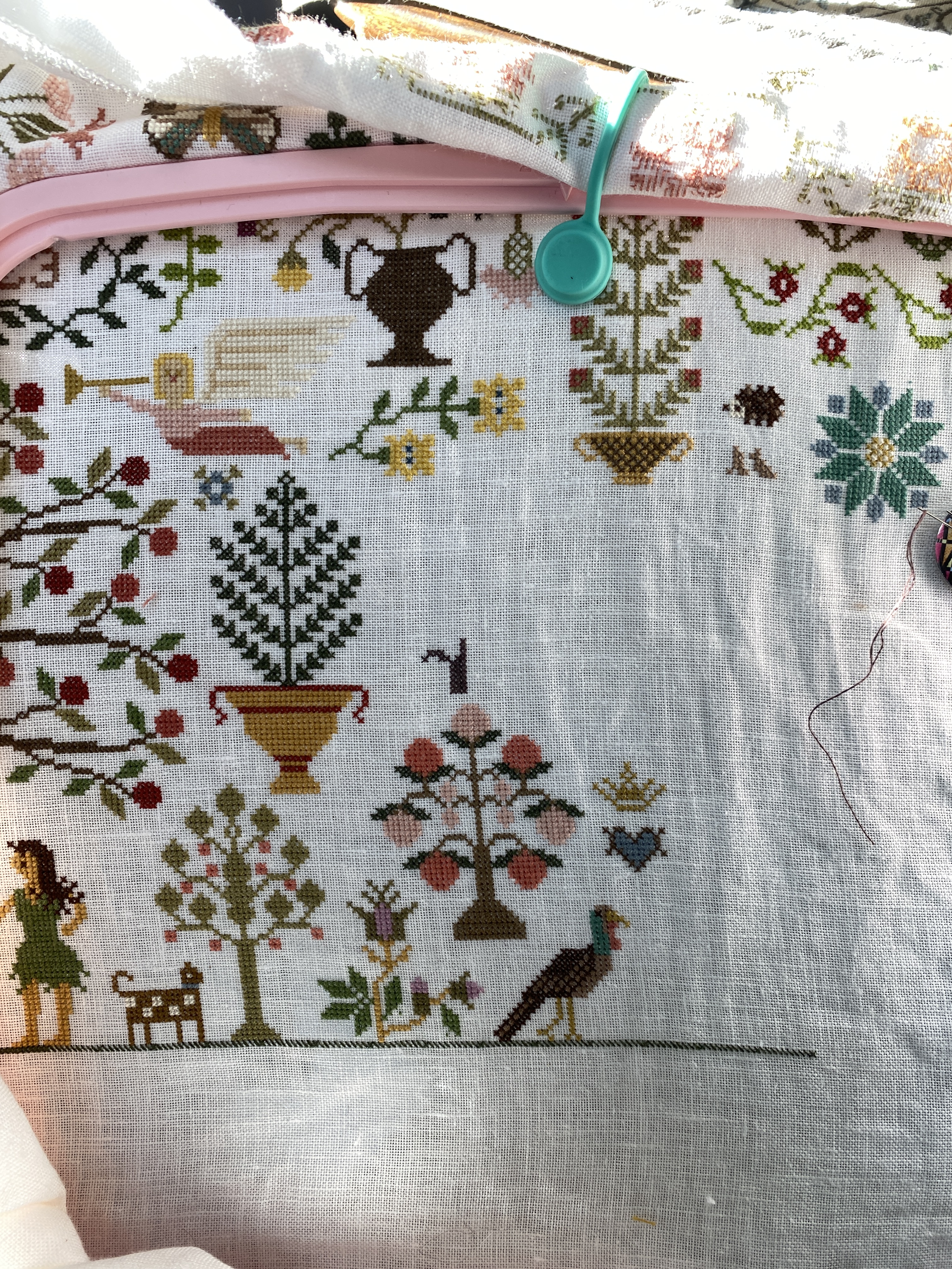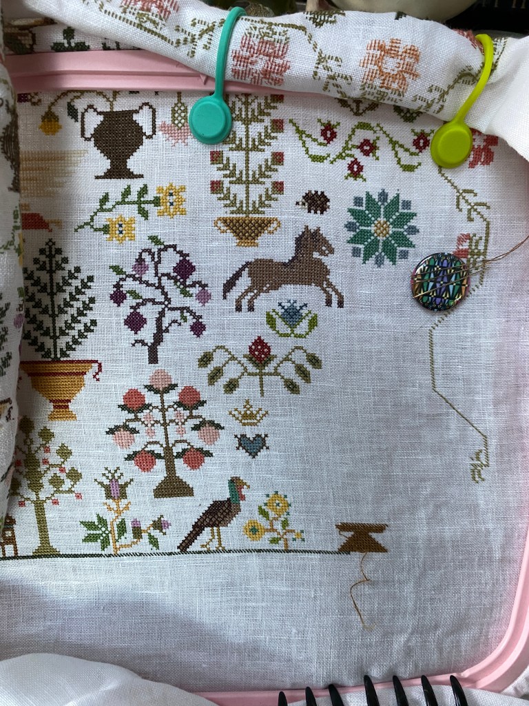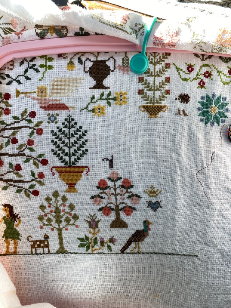 I broke down and ordered a custom frame for the Fabulous Houses. I couldn’t find anywhere to order spacer bars in a small quantity, and the frame I have was not going to work. The new frame (18 x 24), acrylic sheet, backing and spacers were about a hundred dollars, shipping another 17.00, still way less than having it professionally done. I’ll tackle it once I return. More motifs have been stitched on the Lillies of the Field (started 7/23) piece. I have been trying to do more, but with all this busy-ness during the day, I find myself nodding off while stitching. Thankfully it’s not as dangerous doing so during other activities.