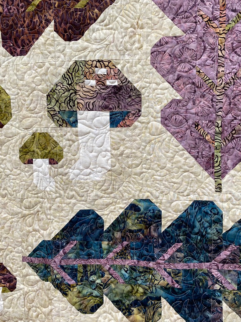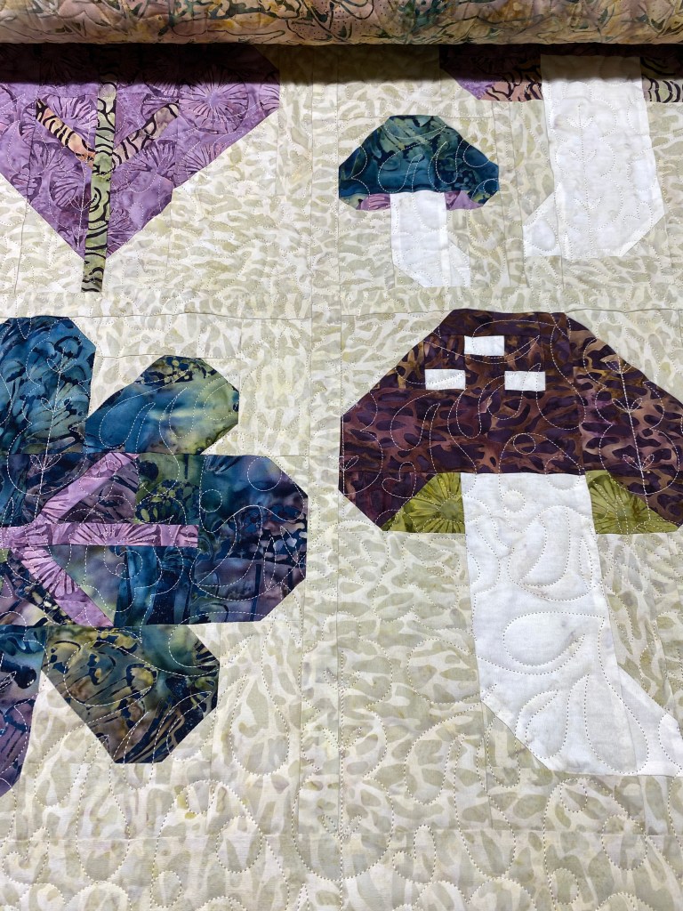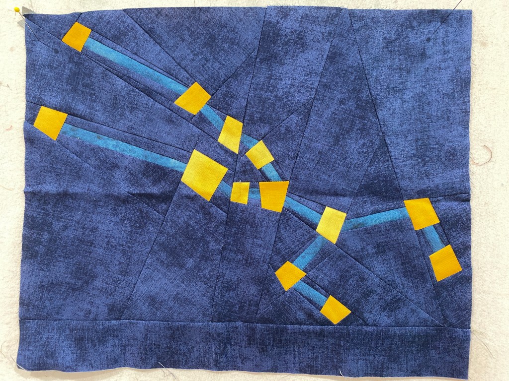 The forest fungi quilt is quilted and bound. I got the kit on 4/21 and finished the quilt on 5/7, pretty good turn-over rate. This is a gift for a friend who I will be seeing Sunday, so all good there. I used a washable wool batting for this batik quilt and I really like how it feels, light and airy. Plus, the quilting shows up just enough for a bit of texture. I find that batik quilts often look flat and can feel heavier than “regular” quilted fabrics. I used my go-to needle, 100 chrome universal, for the quilting, with no troubles. I whipped up the Starry Signs Taurus block too.