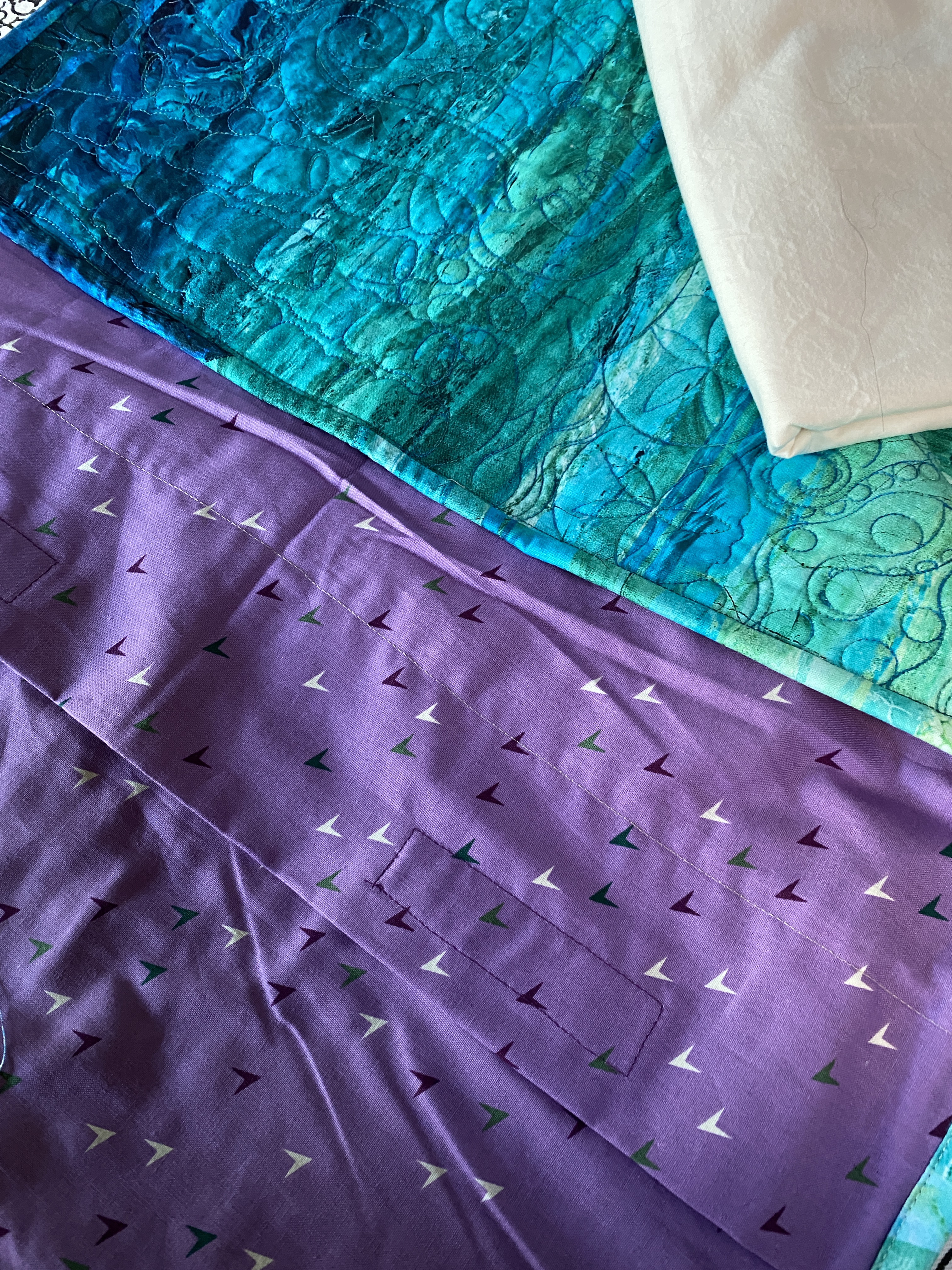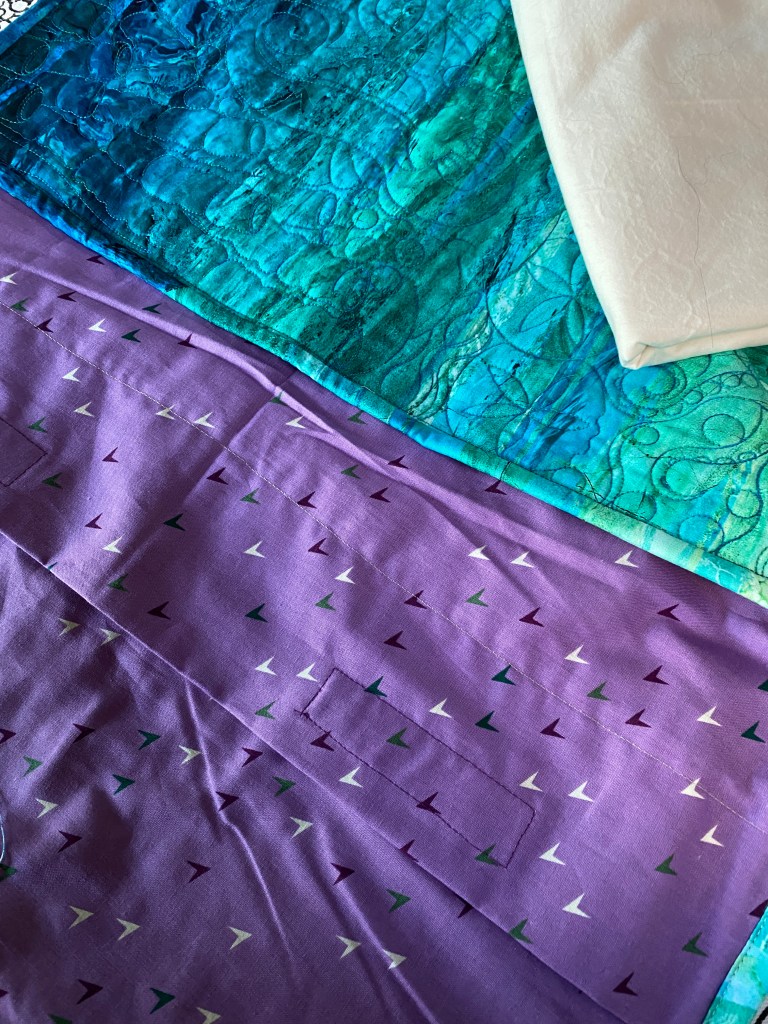 The Tummy time Mat (under the sea quilt) is together and ready to go. I made an envelope style backing with velcro closures and added it to the quilt. I sewed it all together, the quilt and the extra back, with a binding to match the front. Then I made a large liner cover to fit inside the pocket. I will fill the liner with two layers of thick poly batting to give a little cushioning. – Depending on how the parents feel about it, the baby is almost 6 months old at this point, but fluffy things are discouraged.