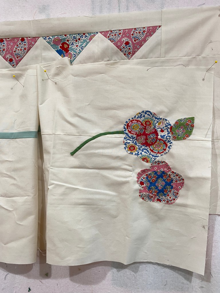 I wanted to get my take-a-long (the Tilda quilt) hand project ready to go. I am almost finished with the appliqué on the main piece, but needed to trace the top and bottom sections and get the fabrics basted on. I was able to get that started yesterday and decided to take only the top piece as there is probably enough to keep me busy. Today I’ll spend some time basting the rest of the flowers and leaves. It is my goal to finish this before November, I bought the kit on May 7 last year. That makes me laugh, I looked back to that post, 4 Patchy Patches. I had the best intentions of finishing it before November 2024, now I am shooting for November 2025. The other appliqué BOM, Message in a bottle, needs to be back in the rotation too. I started that as a BOM in August 2022, Hmm. Once I get back, I will take it out and assess. I think there are three more large appliqué blocks and a bunch of smaller pieced blocks left to do. Ew, looking at the pattern picture, I know I have not done any of the outer border blocks. I might try some machine appliqué techniques there, I really don’t like making the same blocks over and over even if they are scrappy.
