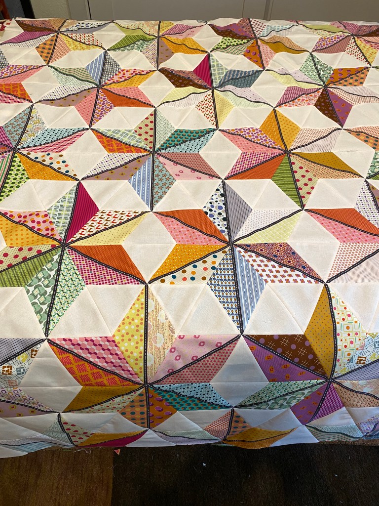 This past week I put together the Licorice and Lollipops quilt top. It went together very smoothly. There is so much variety in the fabrics that I didn’t have to spend much time playing switch a block. The bonus quilt, made with the left over triangles, is another story. I made the 52 blocks easily enough, pressing all the seams open takes a bit of extra time. Now they are up on the design wall, every time I look at it I find a switch that needs to be made. I am hoping to get this one together and off the wall this weekend.