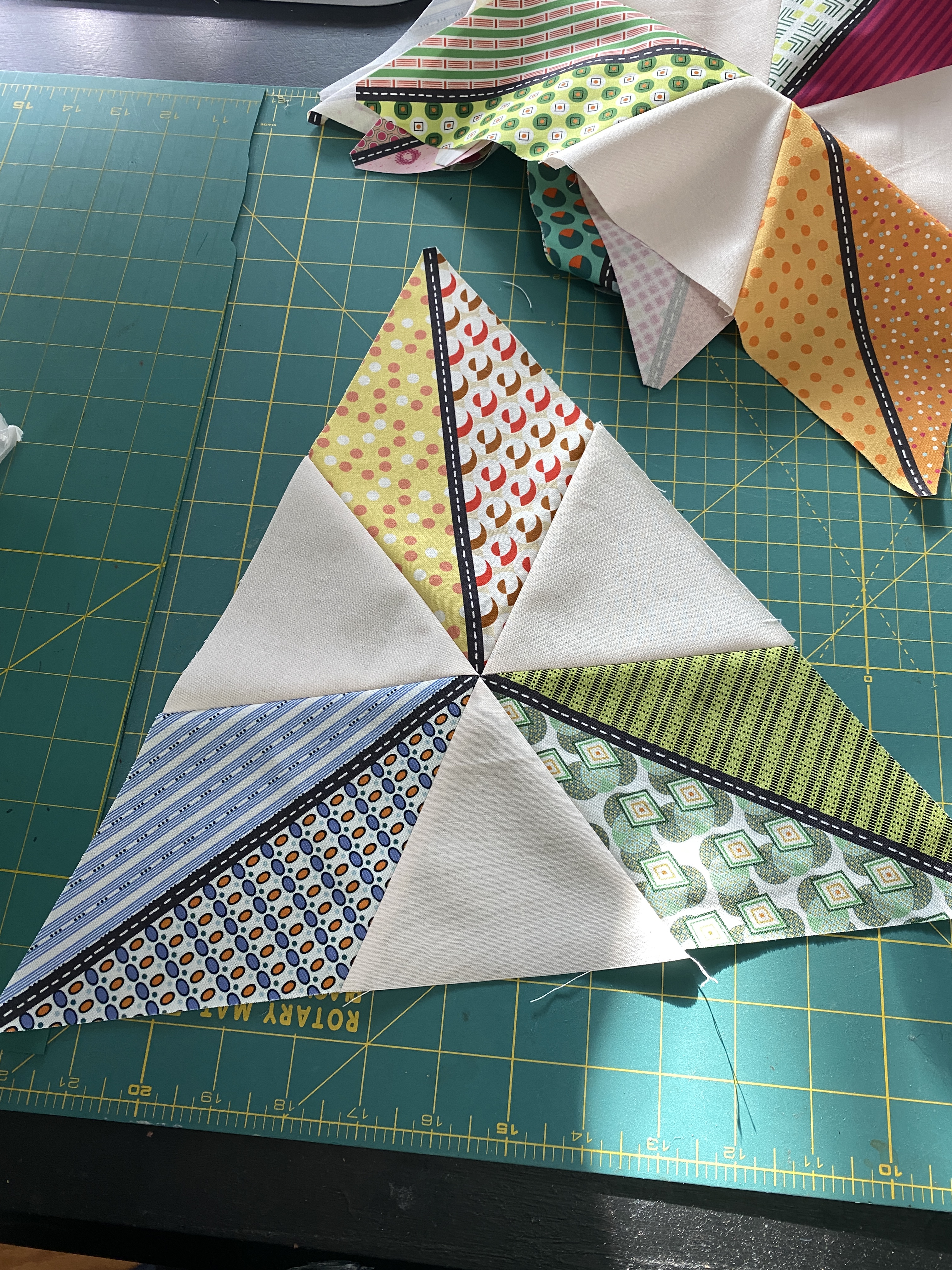 This past week I put together the Licorice and Lollipops quilt top. It went together very smoothly. There is so much variety in the fabrics that I didn’t have to spend much time playing switch a block. The bonus quilt, made with the left over triangles, is another story. I made the 52 blocks easily enough, pressing all the seams open takes a bit of extra time. Now they are up on the design wall, every time I look at it I find a switch that needs to be made. I am hoping to get this one together and off the wall this weekend.