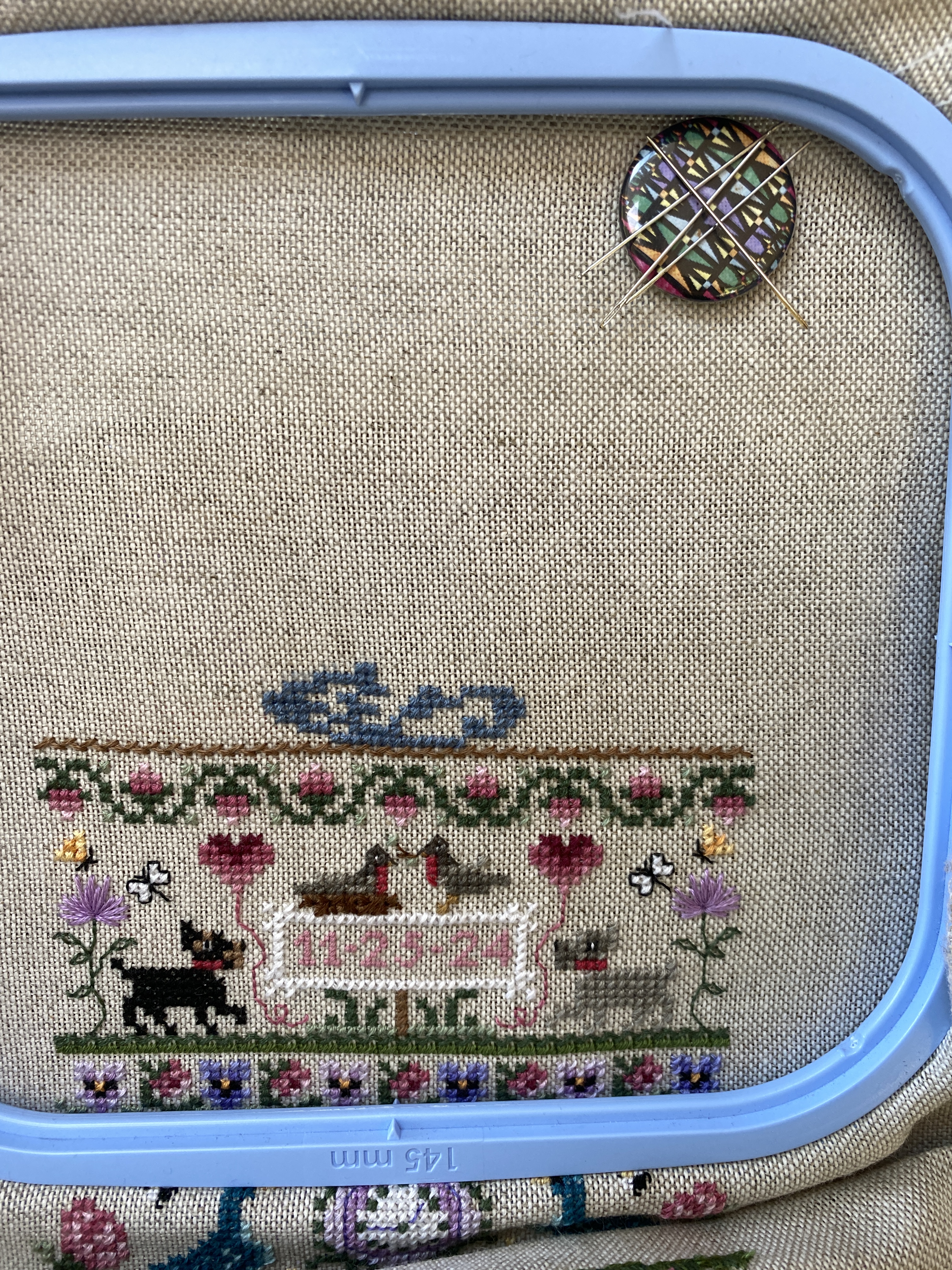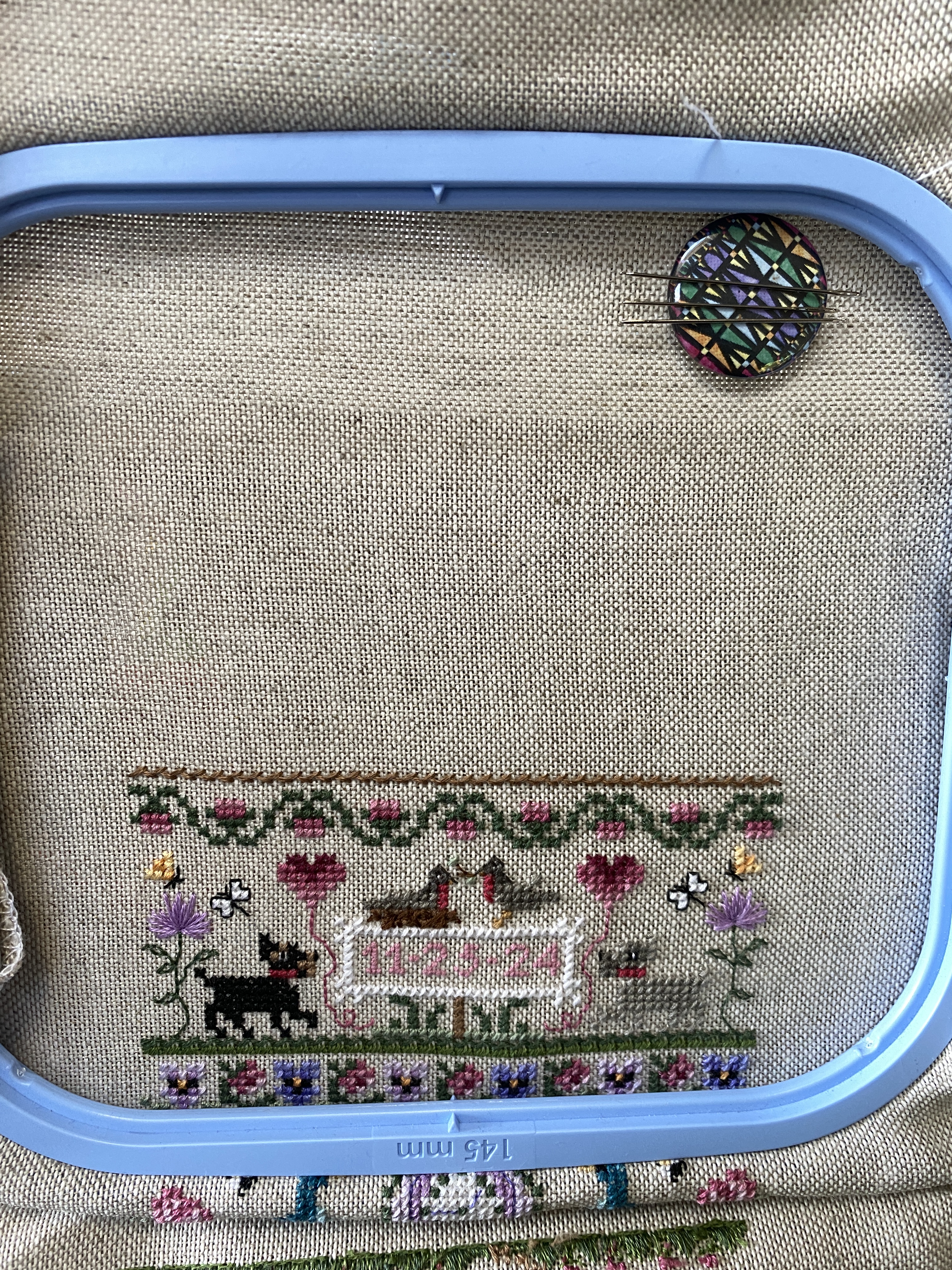 I have been doing other things too, I got a lot more sewn on the baby sampler, so many thread changes. I sometimes feel like I spend more time burying threads than making stitches. I am happy that this is a smaller piece though. I think I am about half way through, I will need to graph out the name, so it is centered. I winged it with the birth date, and got lucky. Nobody likes to frog ‘over one thread’ X’es.