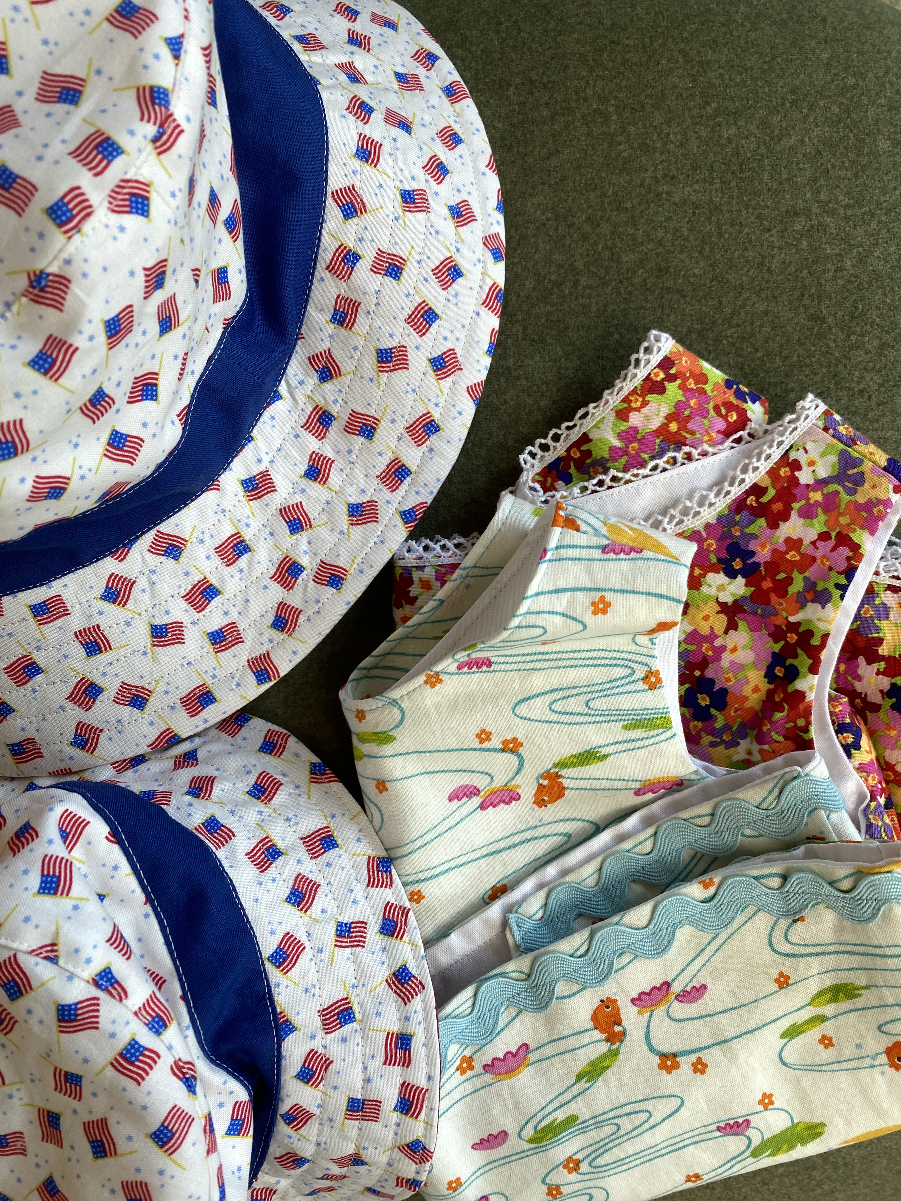 I made a set of matching bucket hats for an uncle and his niece, Fourth of July is next week, and they’ll be together. I also made two really cute dresses, the trim and rick rack are from old stash, the prints were too. Not me though, sadly I am holding down the fort, well not really sadly, as I will be enjoying a short at home retreat. There will be lots of sewing and early meals and maybe a little firework viewing. The nights lately have been cloud filled, so my view is limited. I’ll probably only be able to hear the booms from the five or six different towns displays near by.